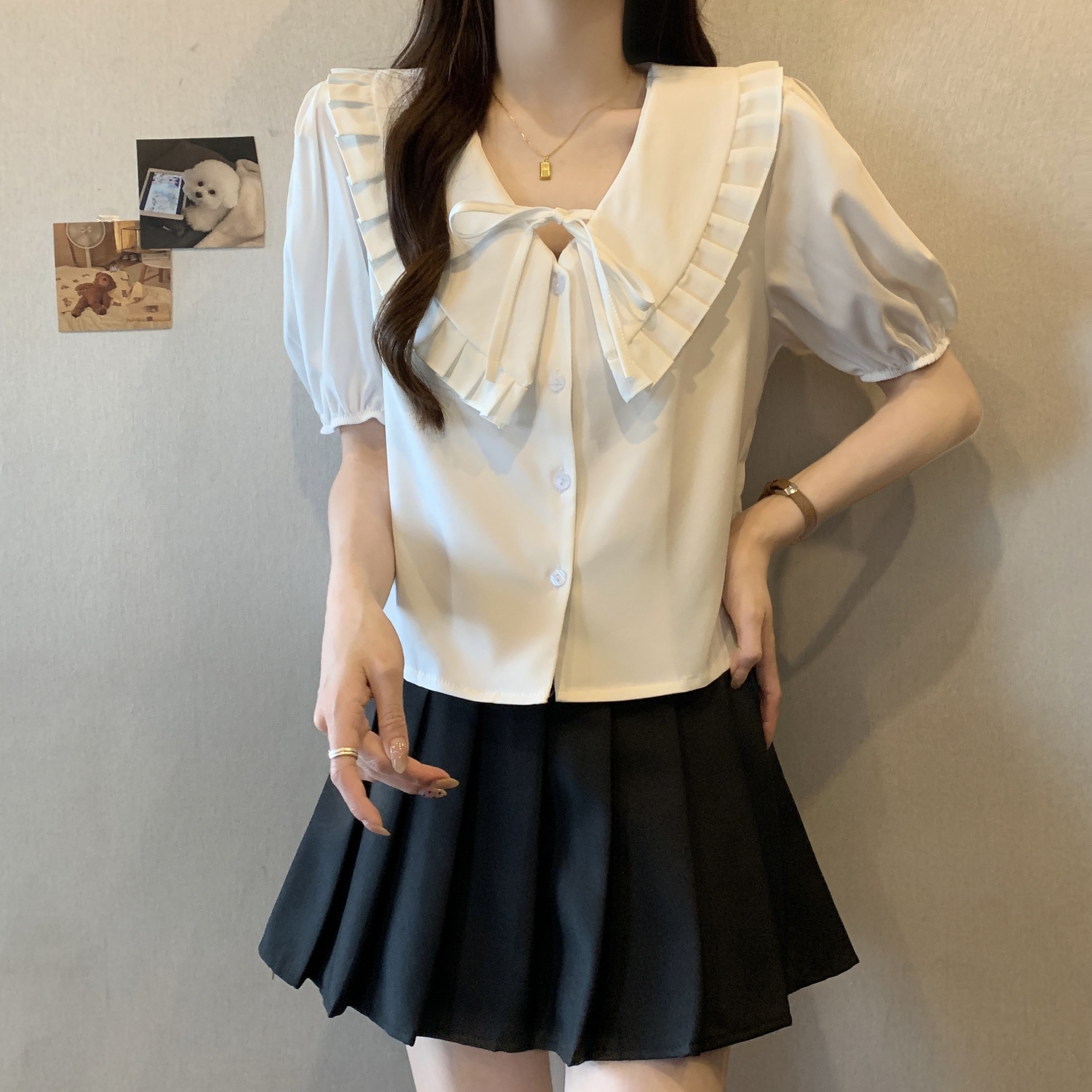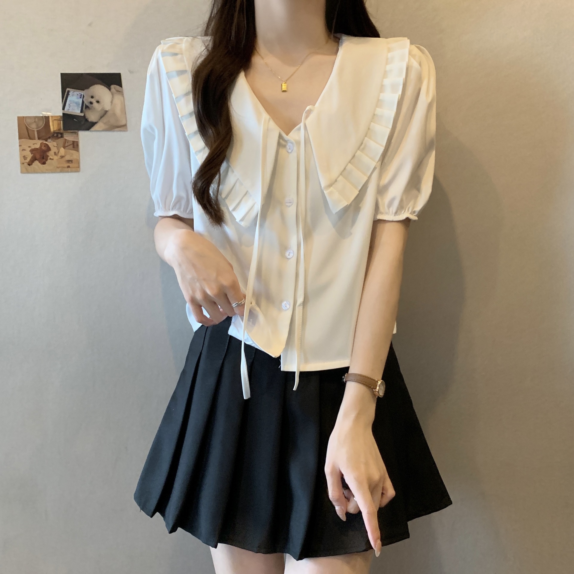 | nameOriginal | French Puff Sleeve Top Women's Summer Doll Collar Short Sleeve Shirt Single-breasted French Pleated V-neck White Shirt |