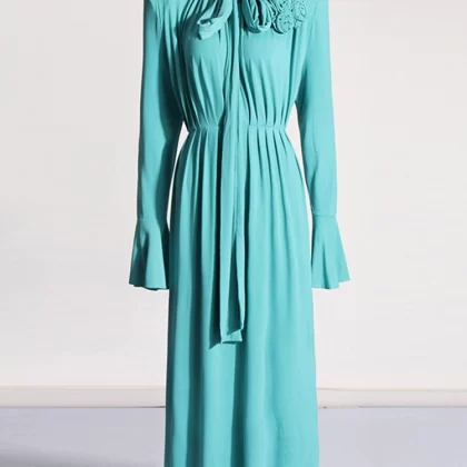 | nameOriginal | French retro bell-sleeved three-dimensional flower-decorated dress for women on seaside vacation photos with shoulder pads and side slits. |