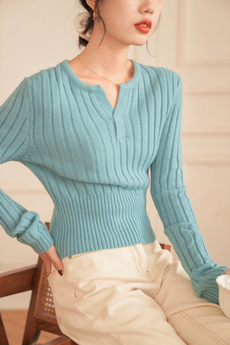 | nameOriginal | French Retro Blue Inner Knit Sweater Tight Waist Slimming 2024 Autumn and Winter New V-Neck Base Sweater Women's Short |
