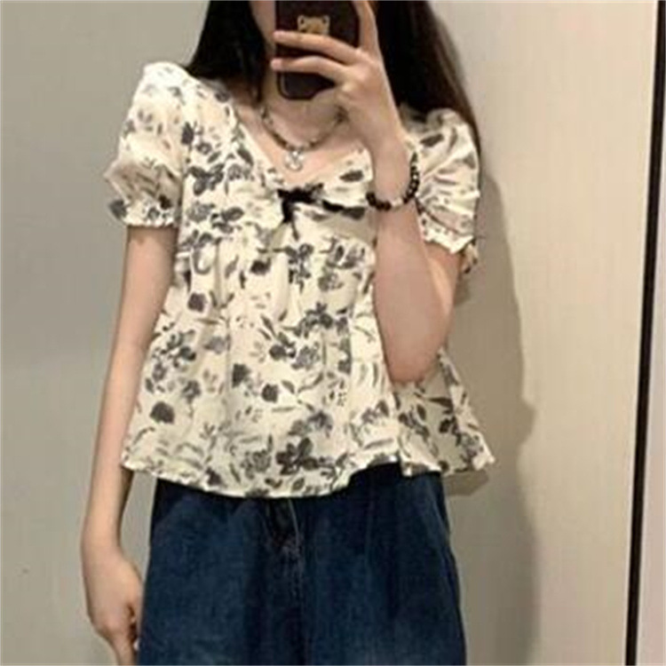 | nameOriginal | French Retro Ink Floral Bubble Short-sleeved Shirt Women's Summer Chic Fresh Sweet Short Doll Shirt Top |