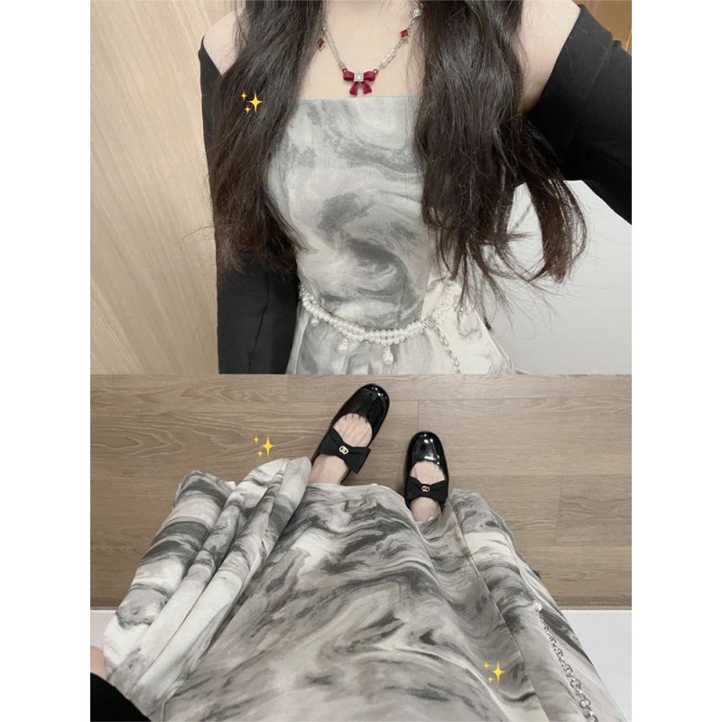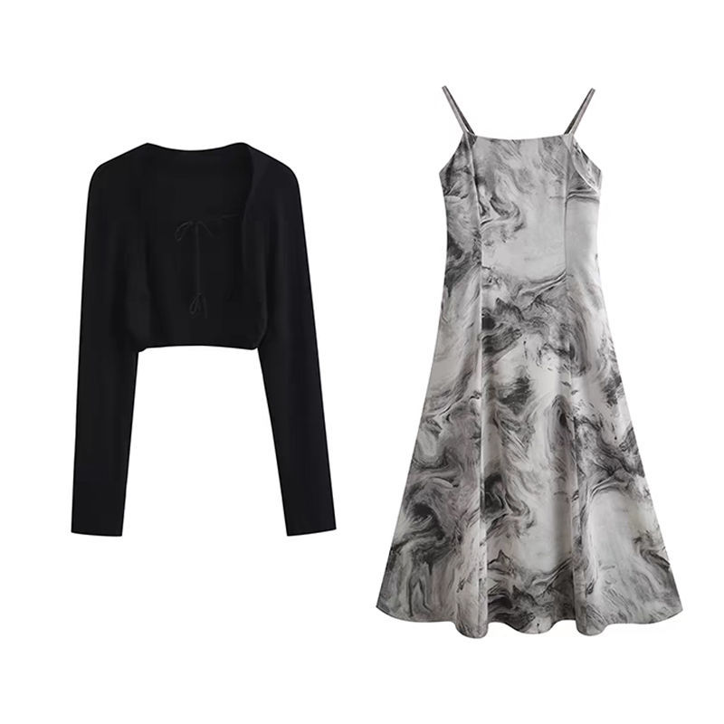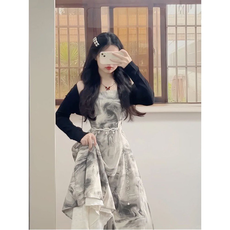 | nameOriginal | French Retro Ink Painting Sling dress suit Women's Spring and Summer Sunscreen Cardigan Pure Desire Elegant Waist Long Skirt |