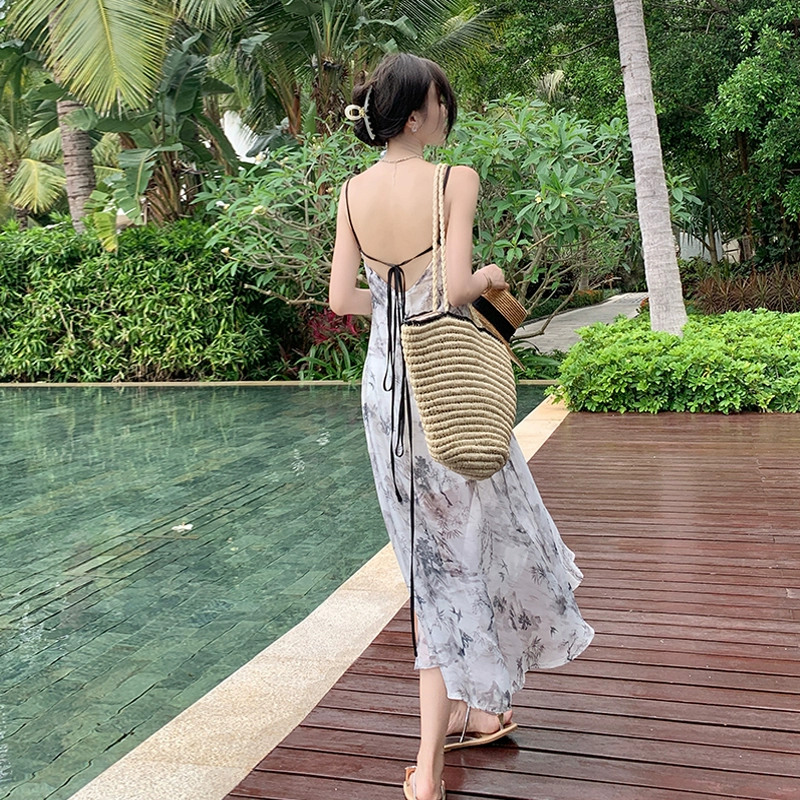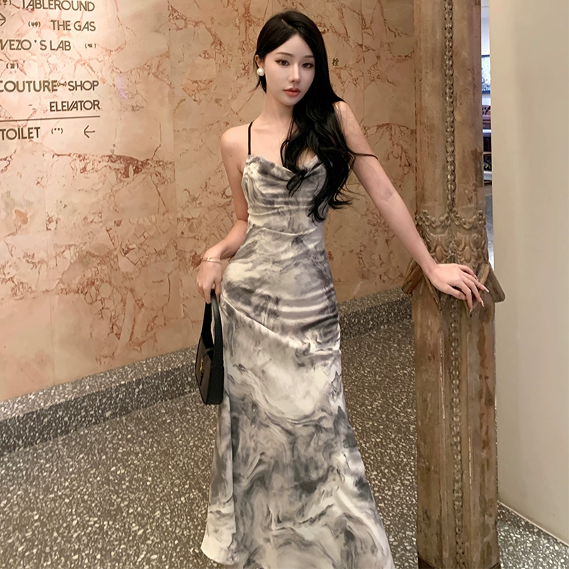 | nameOriginal | French retro ink painting tie-dye backless strap dress sexy high-end pure lust style sling collar long dress |