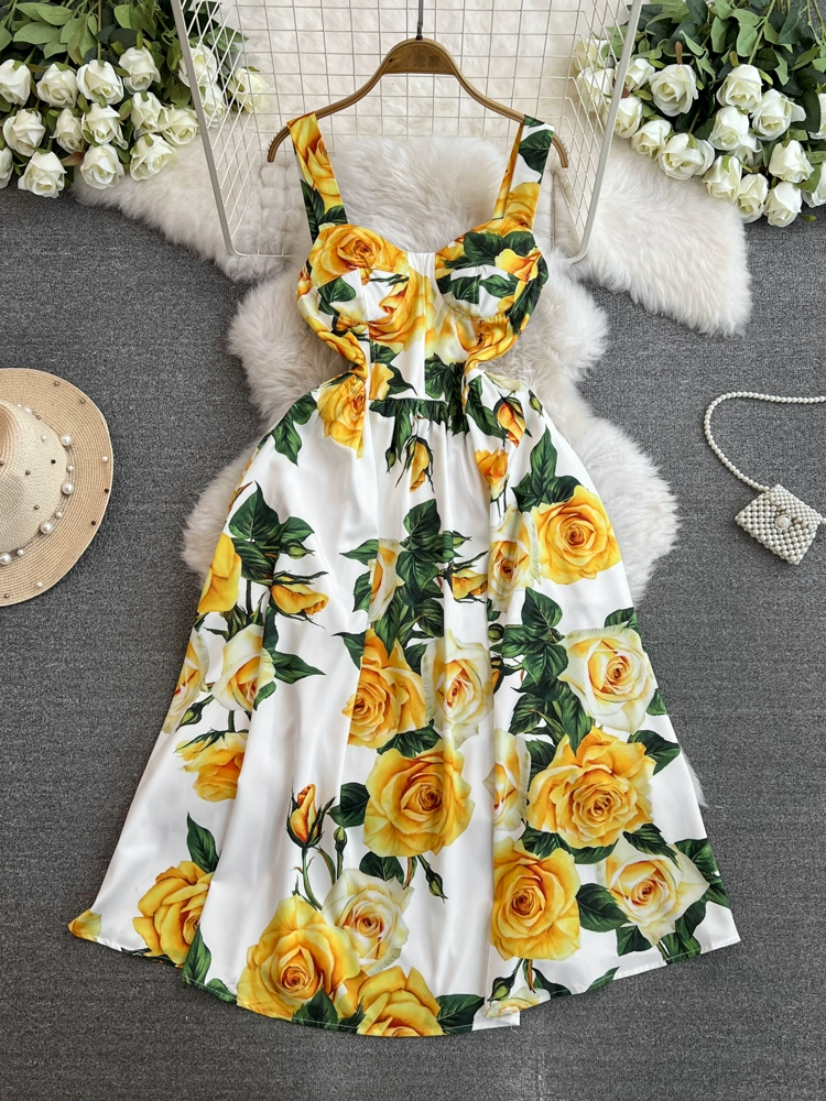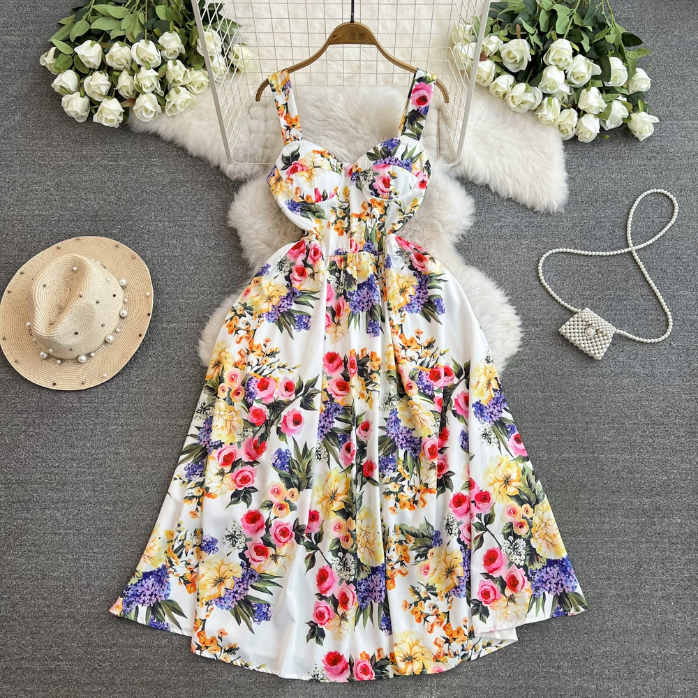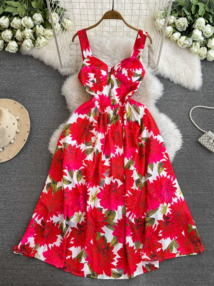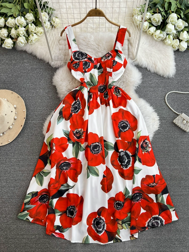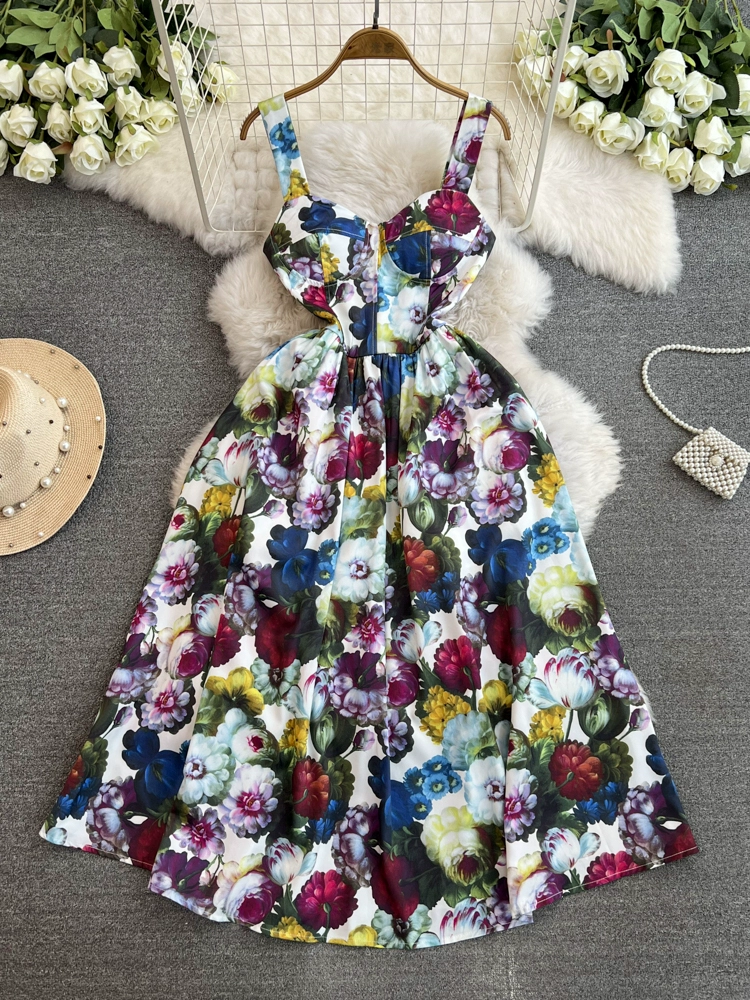 | nameOriginal | French retro oil painting style printed slim-fitting mid-length large hem vacation dress sexy suspender dress women's summer fashion trend |