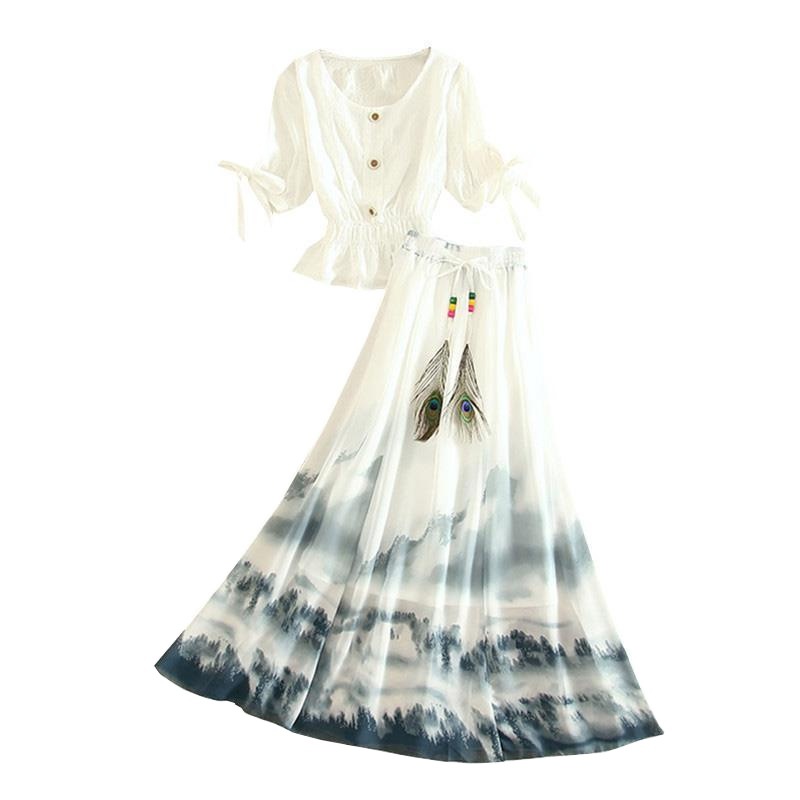 French Retro Printed Skirt Fashionable suit Summer New Slimming Age-reducing Western Style Two-piece Skirt