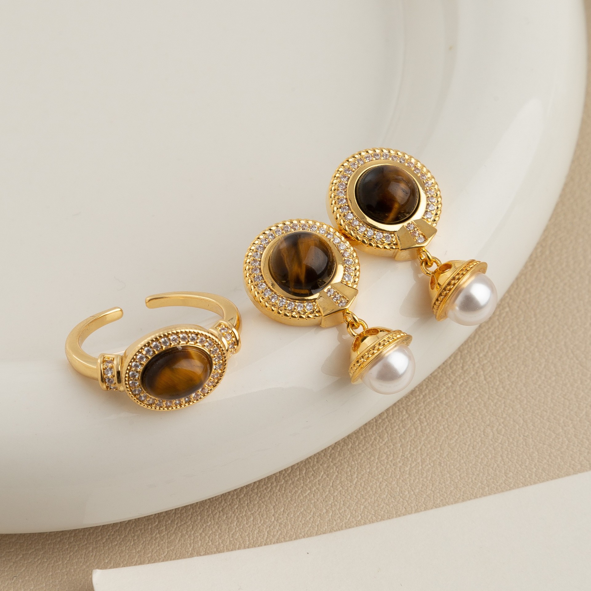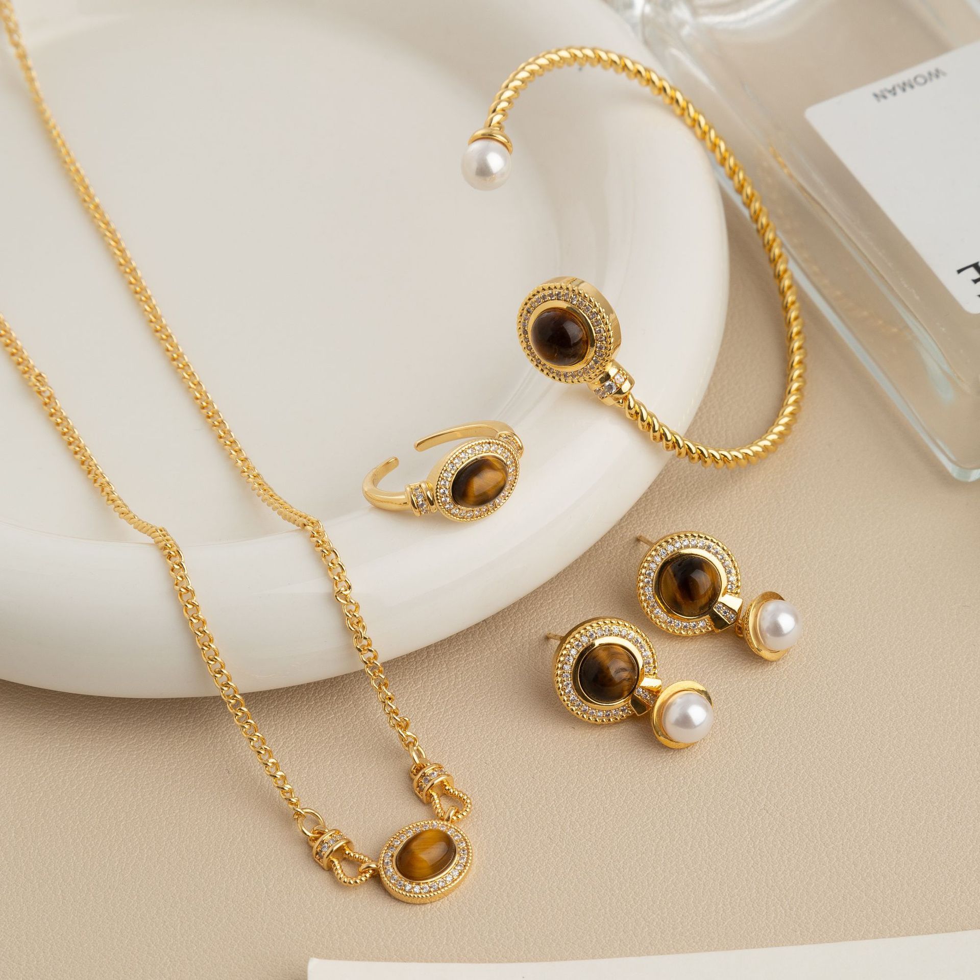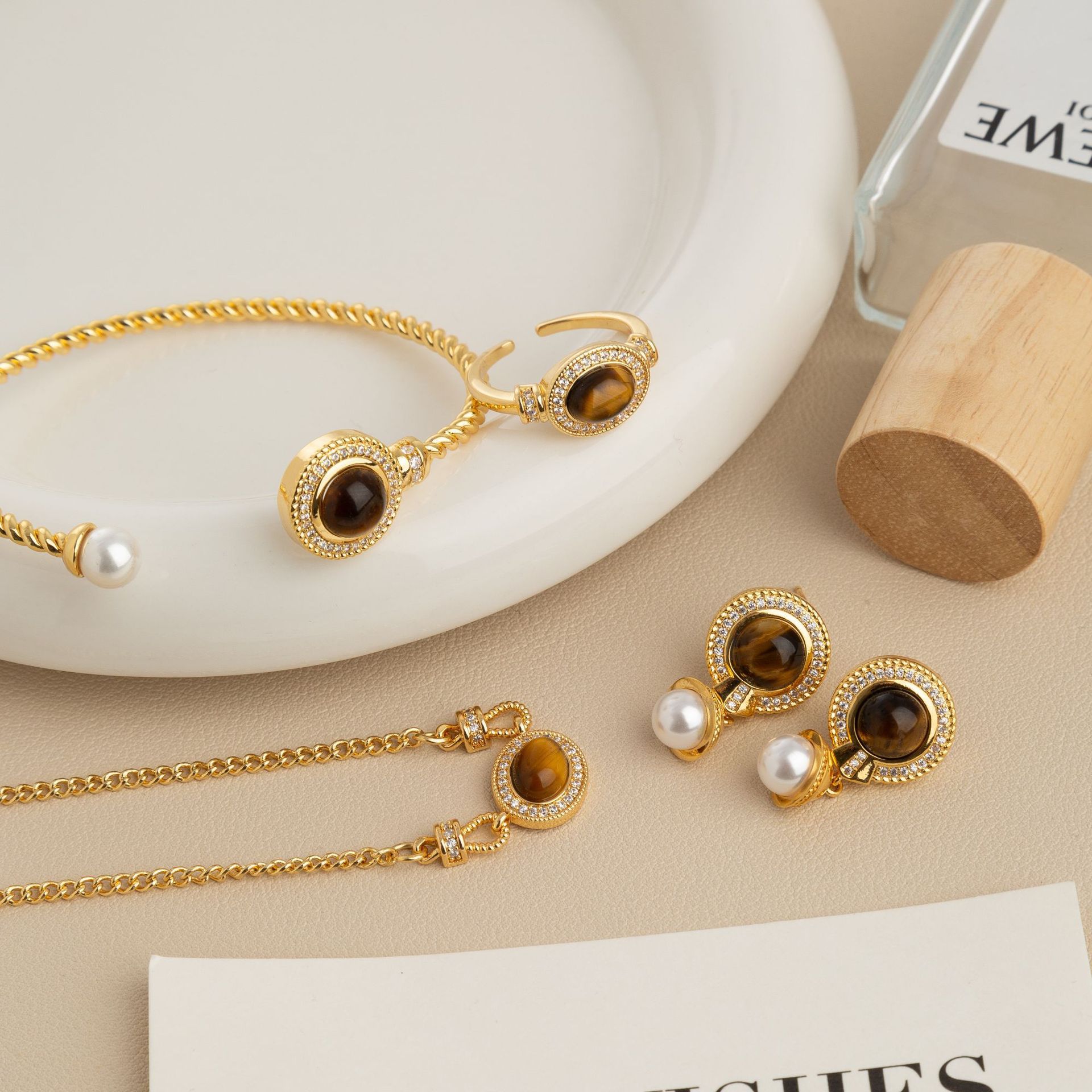 | nameOriginal | French Retro Tiger Eye Bracelet Women's Niche Design Light Luxury High-end Ear Stud Ring Necklace Fashion Personality |