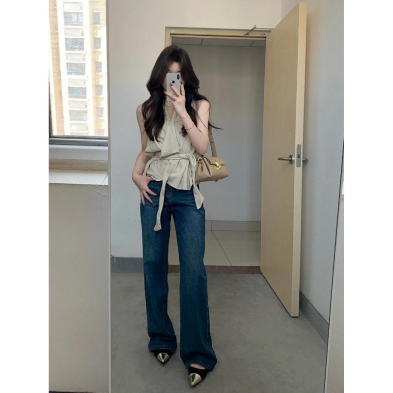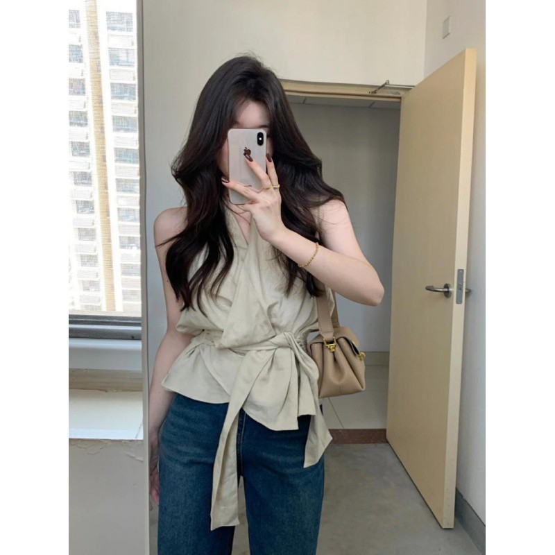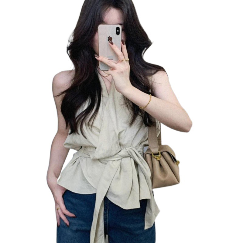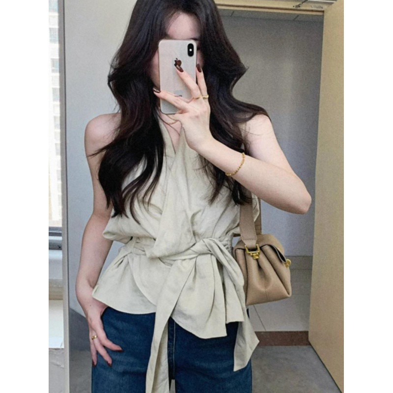 French Retro V-neck Elegant Slim Sleeveless Top Women’s Summer New Spice Girl Lace-up Waist Design Shirt