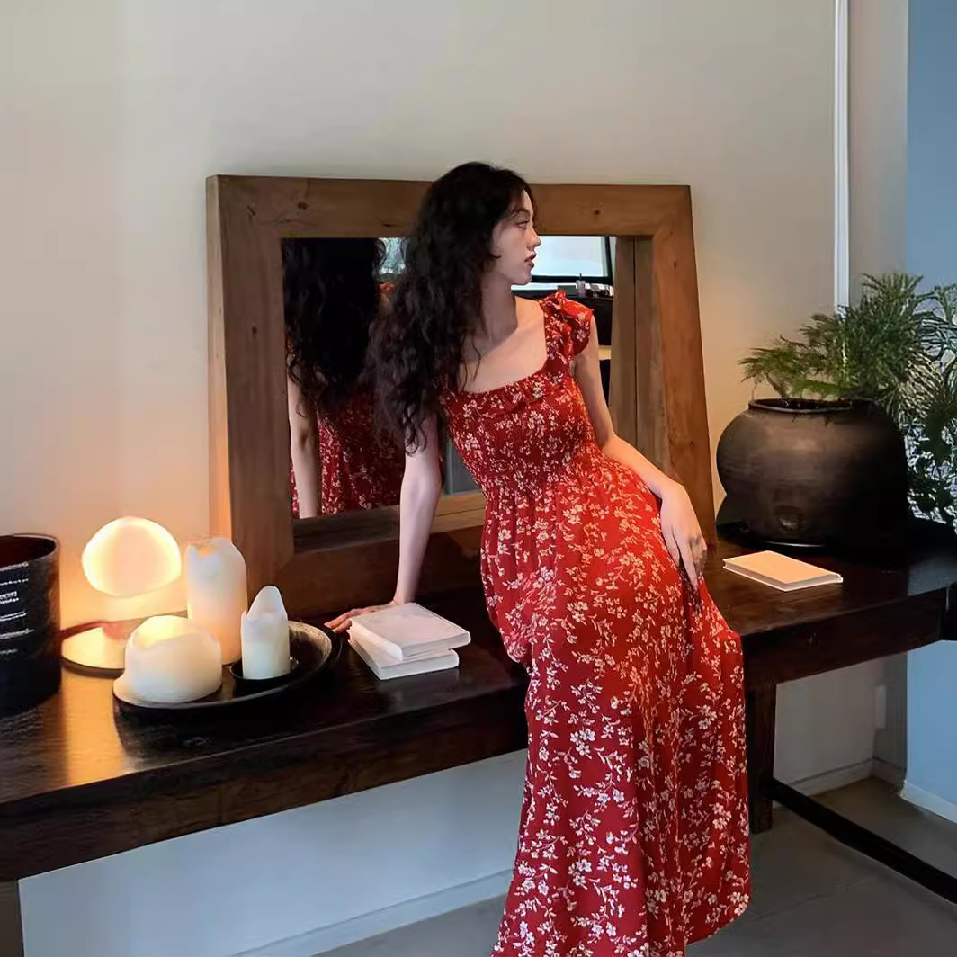| nameOriginal | French Retro Warm Red Floral Small Fly Sleeve Square Collar Dress Summer New Tight Waist Slim Long Pear Shape |