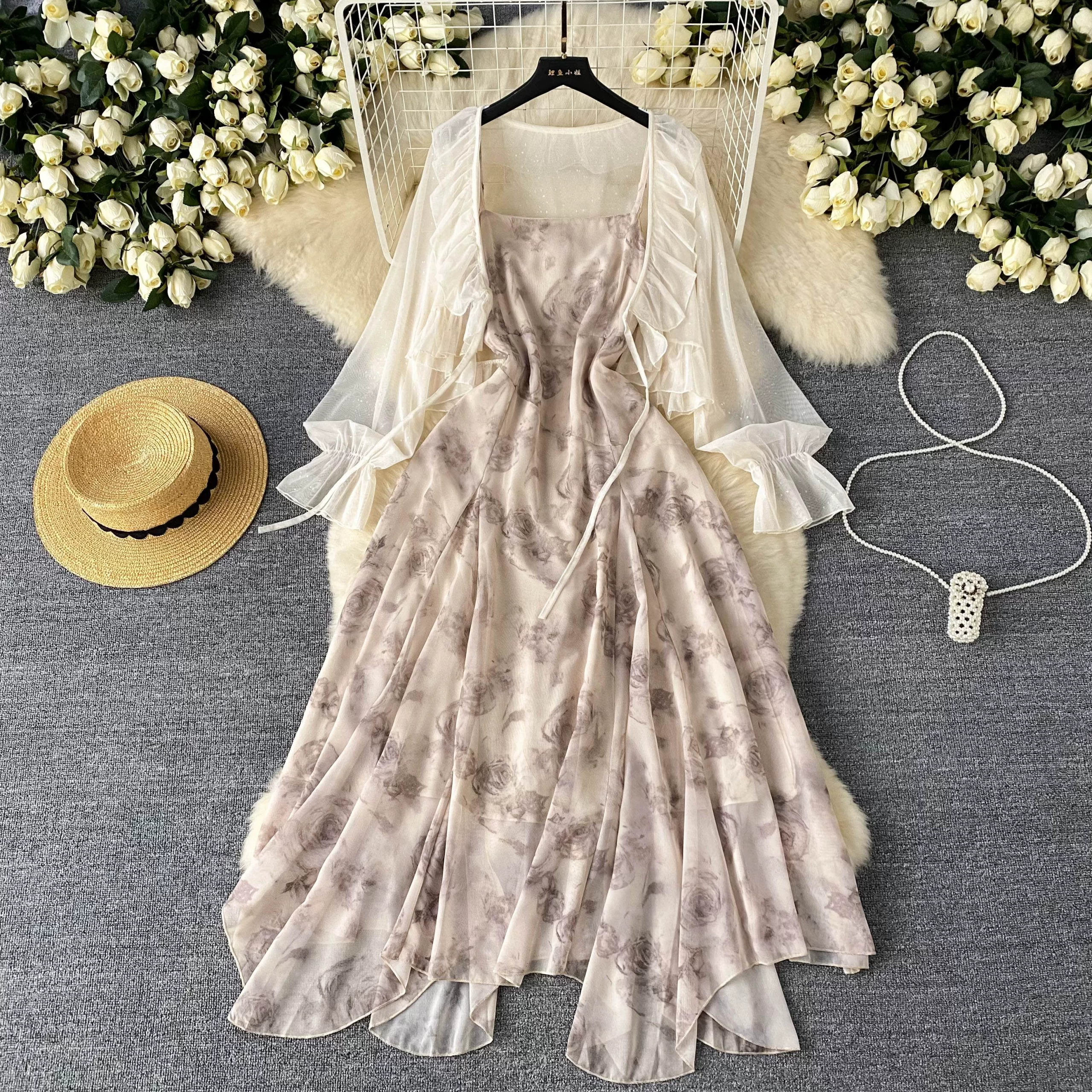 | nameOriginal | French romantic and gentle atmosphere floral suspender dress + ruffled mesh sun protection shirt two-piece set |