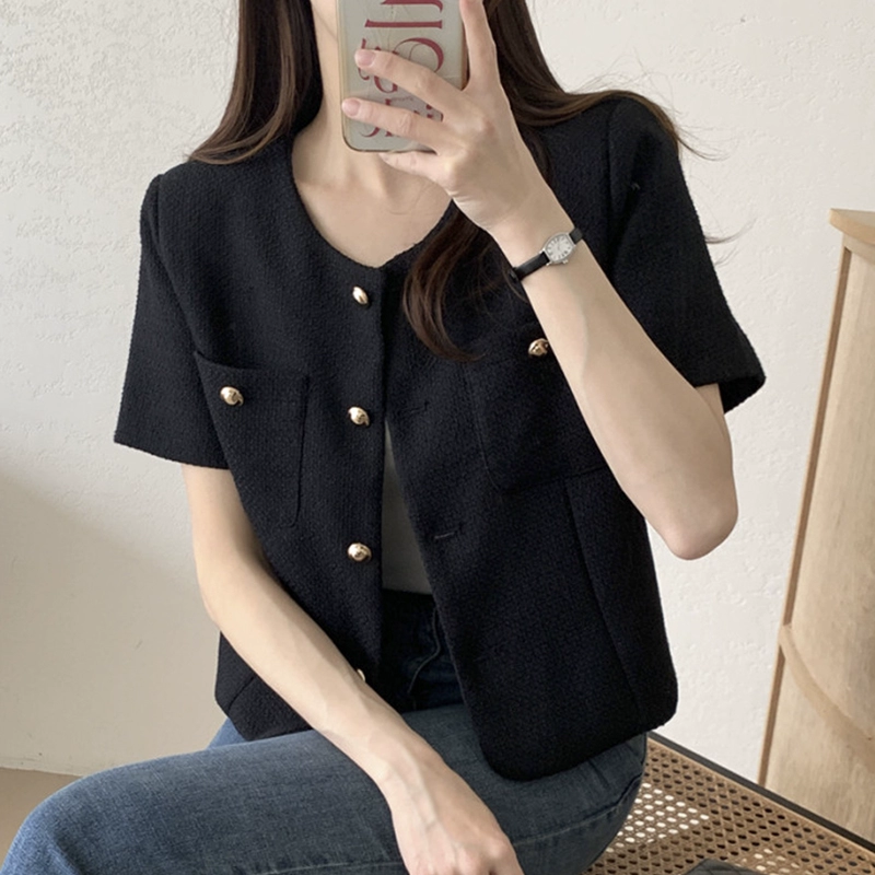| nameOriginal | French round neck short-sleeved small fragrant jacket for women in summer, ladylike style, chic and high-end short outer top |