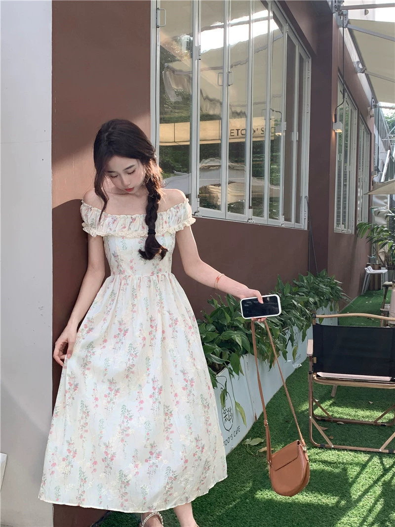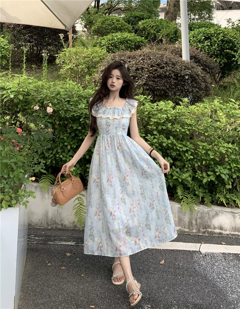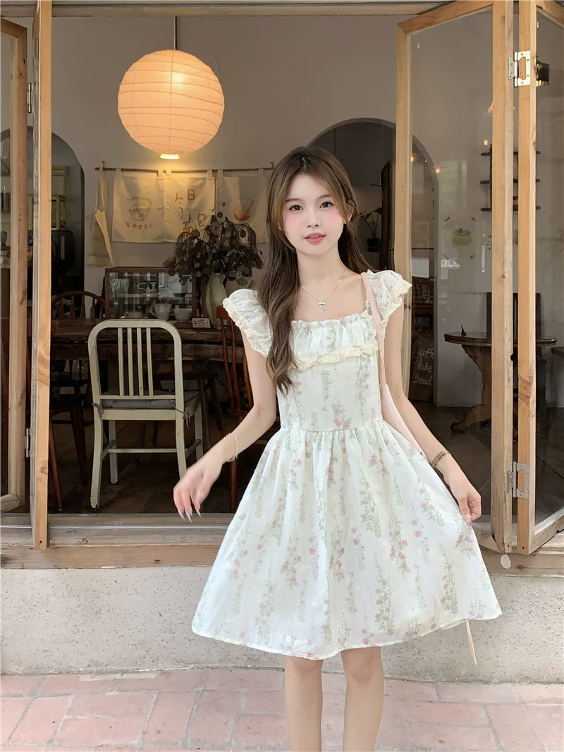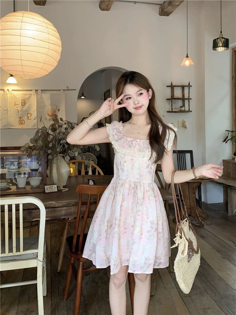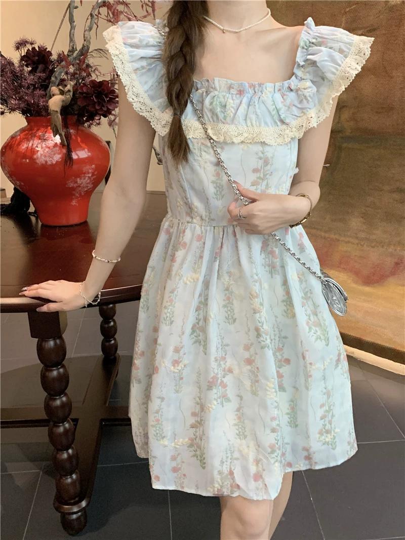 | nameOriginal | French ruffled lace stitching square neck dress for women summer 2024 new style waist-cinching floral tea break short skirt trendy |