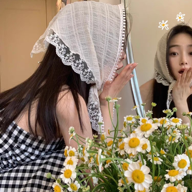 | nameOriginal | French seaside pastoral style lace Plaid triangle headscarf female closed toe sun protection summer retro hair band silk scarf ribbon female |
