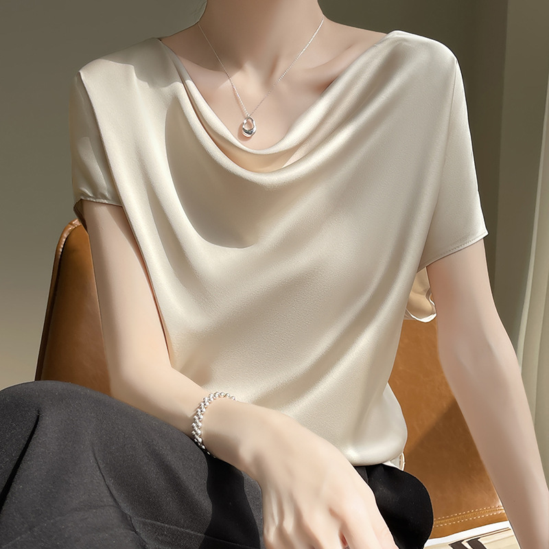French silk pile collar short sleeve women’s acetate satin top 2024 Summer new mulberry silk T-shirt small shirt