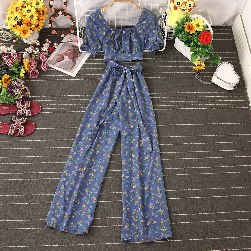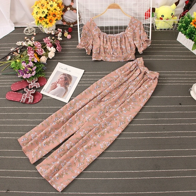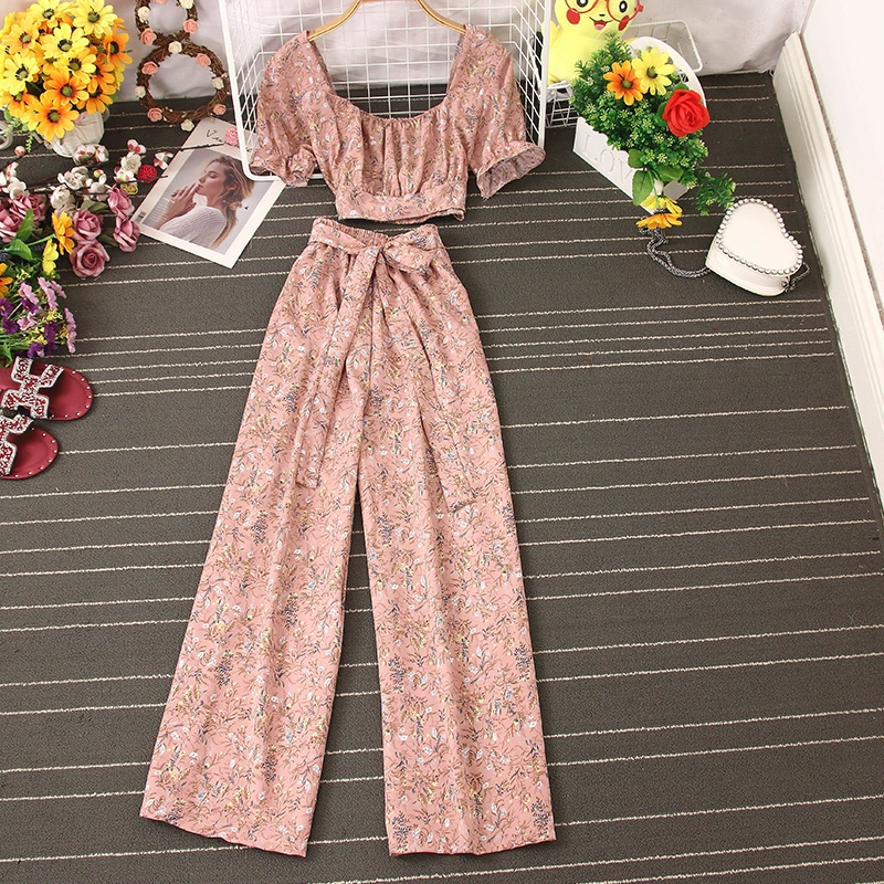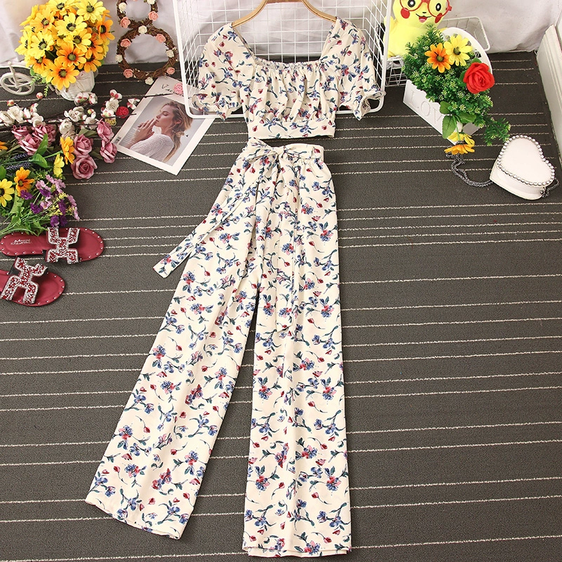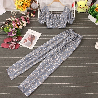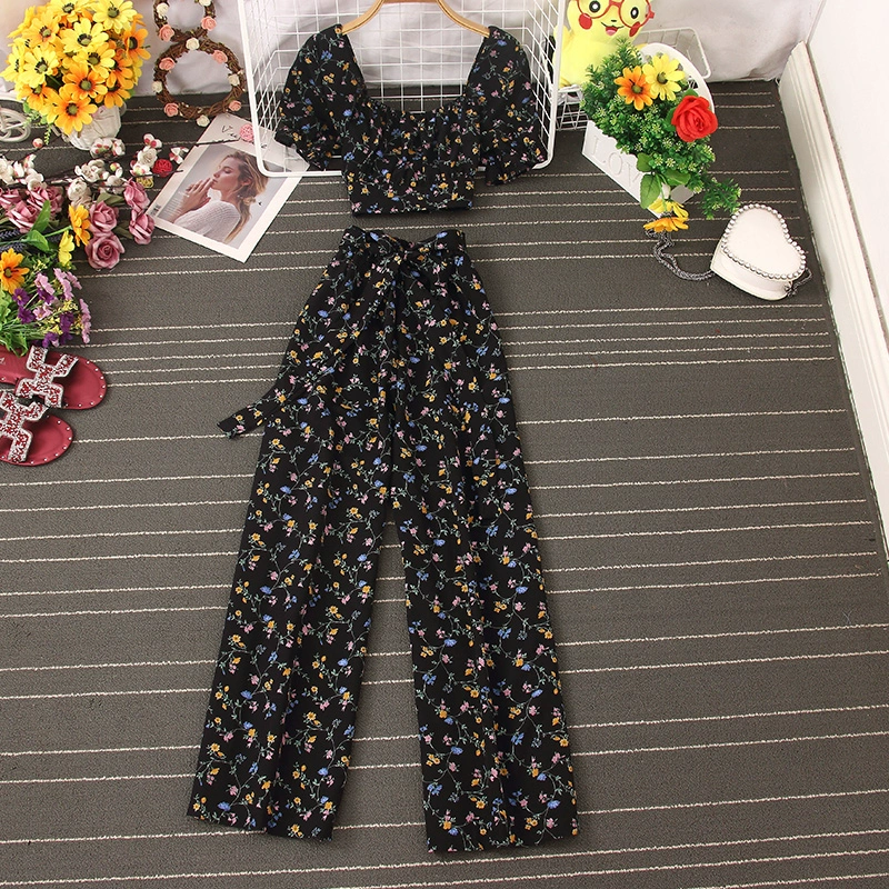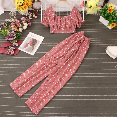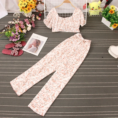| nameOriginal | French square neck pleated chest-revealing short-sleeved waist-revealing floral crop top for women + high-waisted wide-leg casual pants two-piece set |