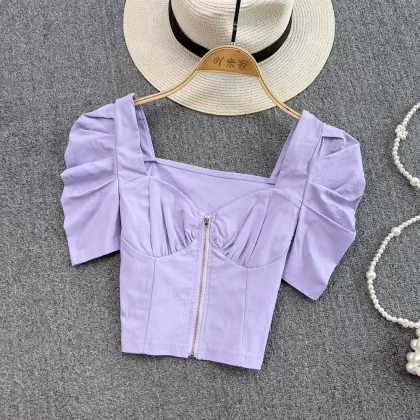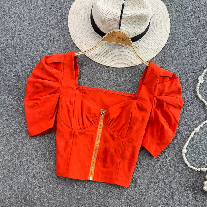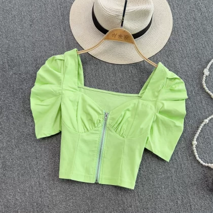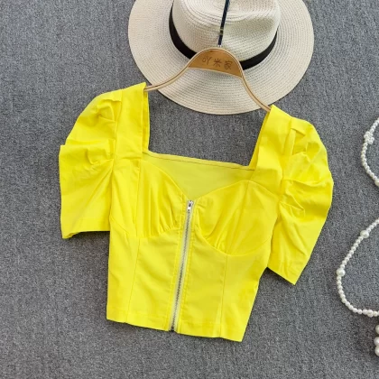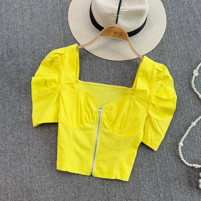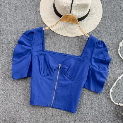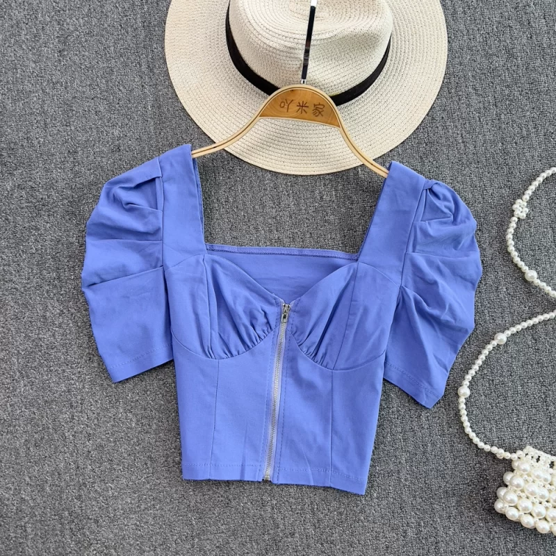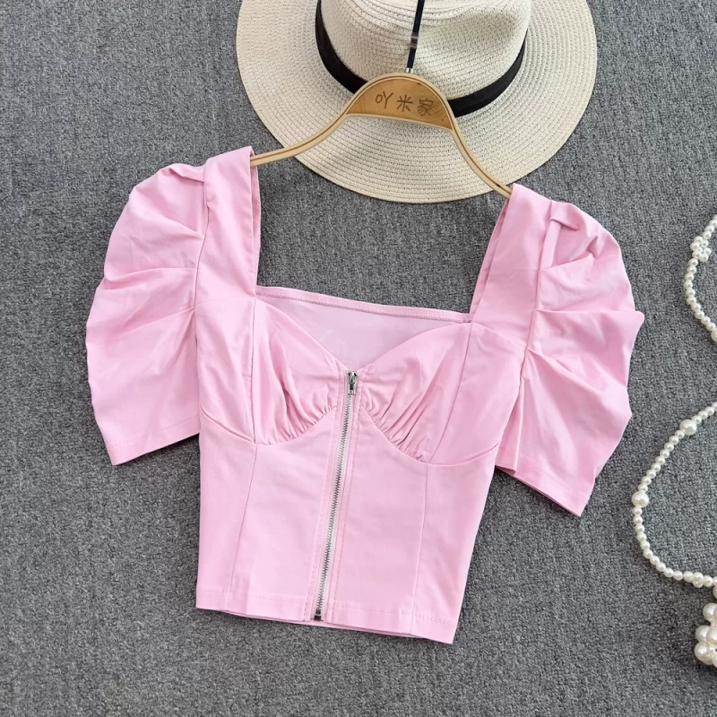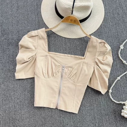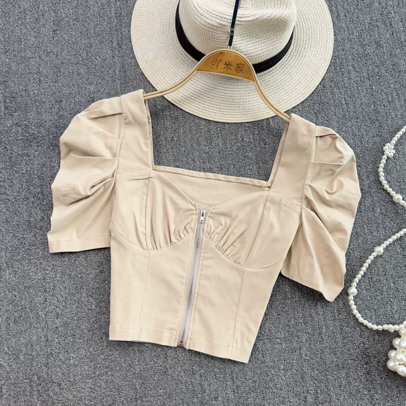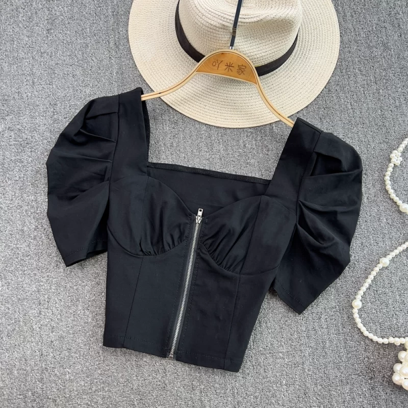 nameOriginal | French square neck puff sleeve zipper shirt slim fit pullover |