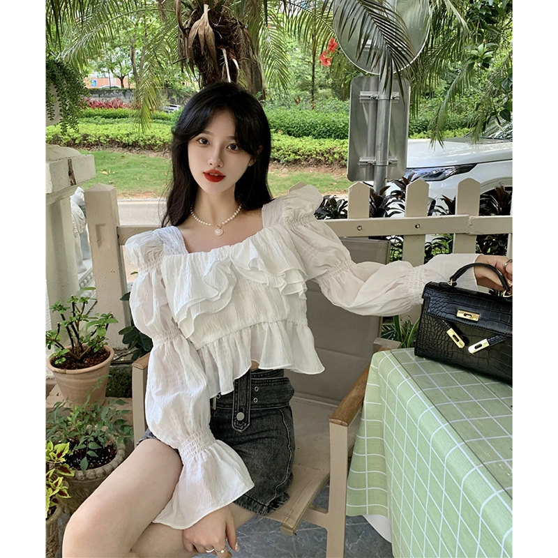 French square neck spring niche ruffled long-sleeved top