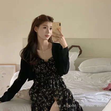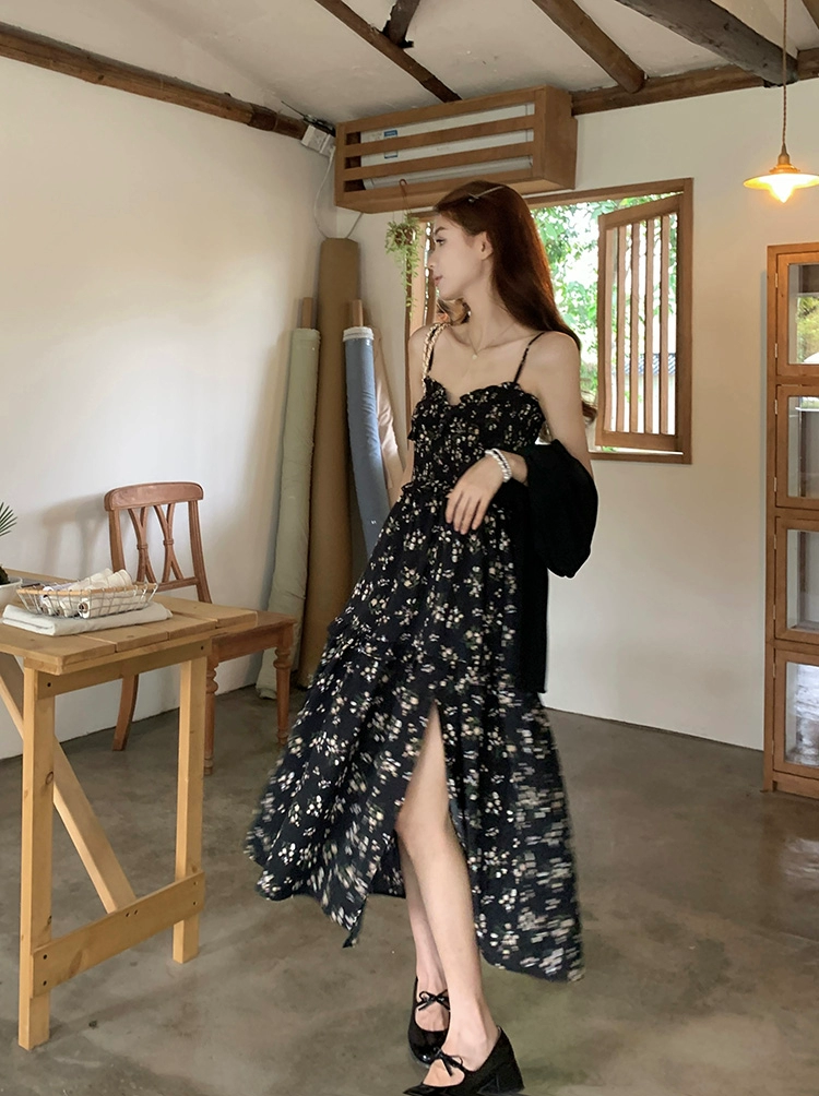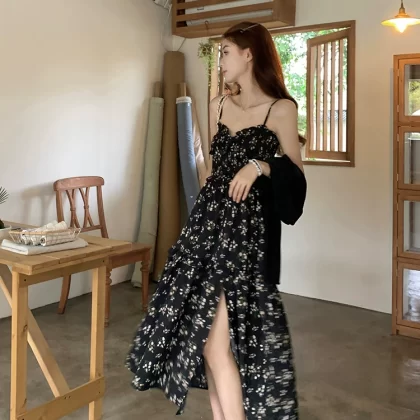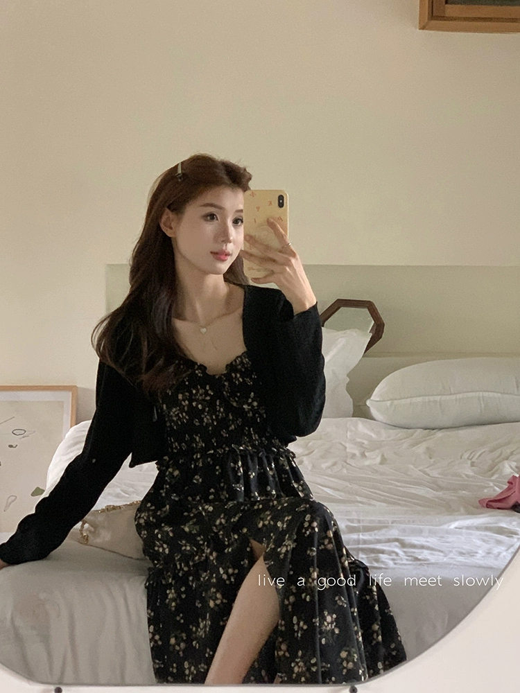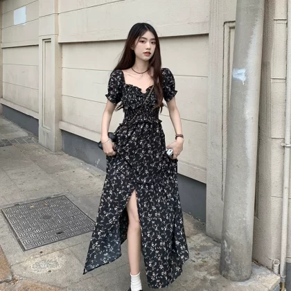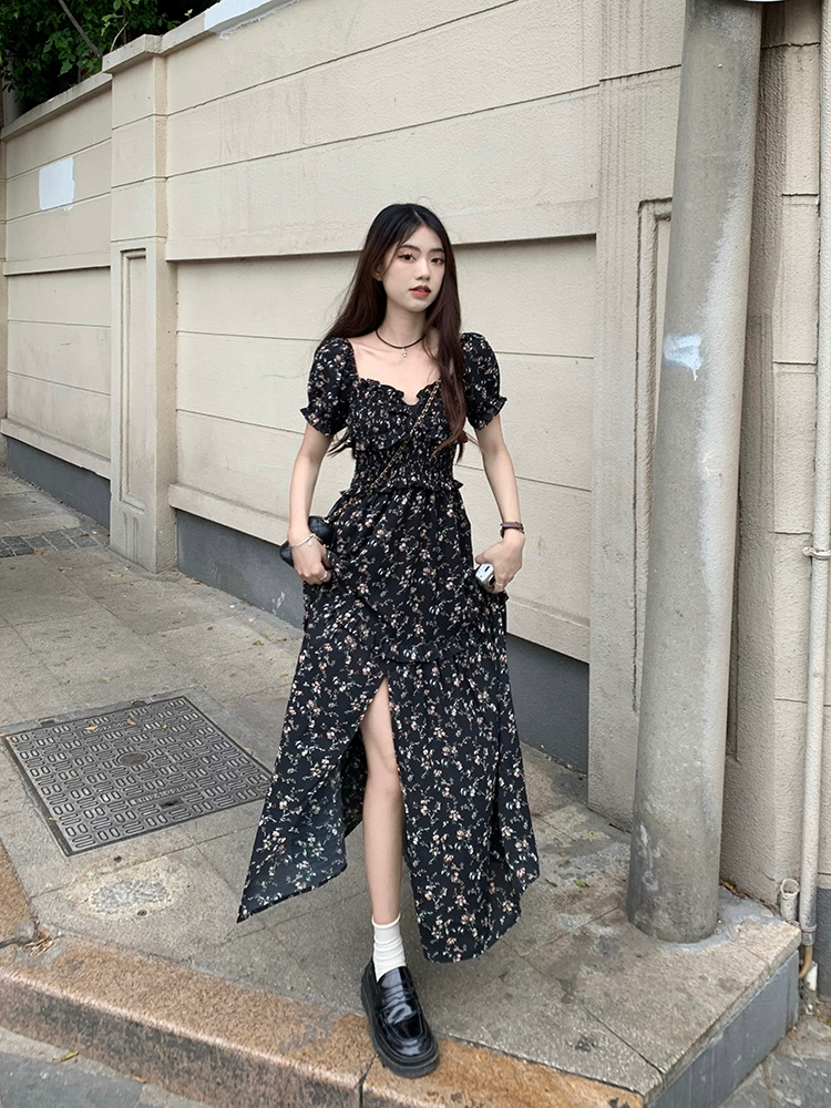 | nameOriginal | French square neck waist slimming slit floral dress |
