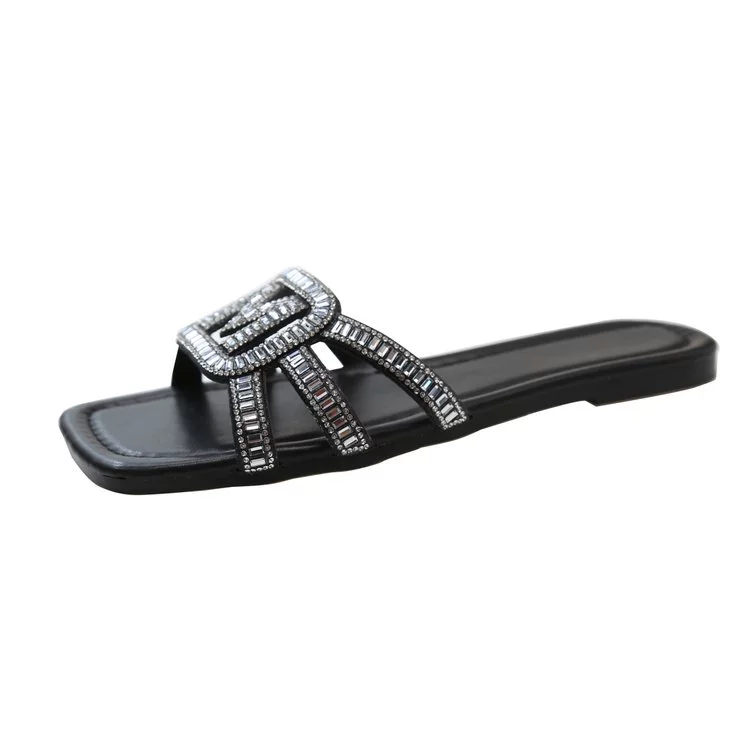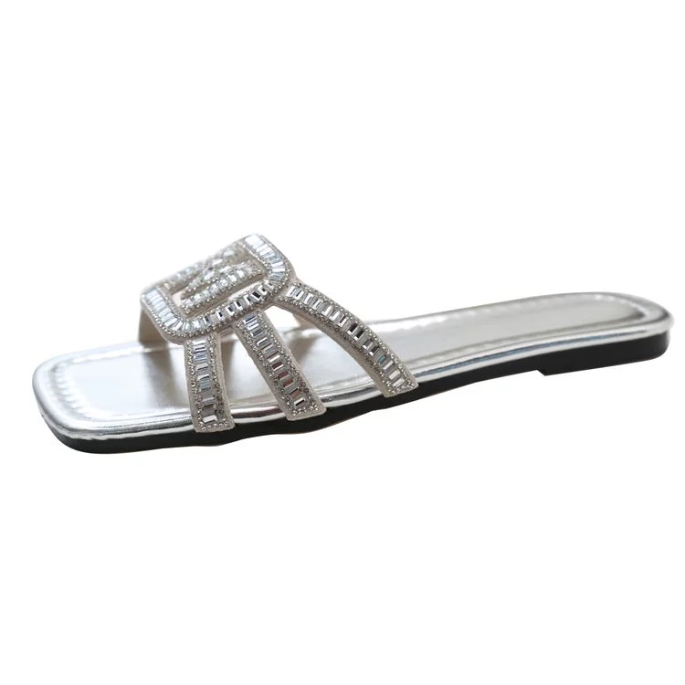 French square-toe open-toe slippers for women for summer new fashion large size sandals flat bottom lazy rhinestone slippers