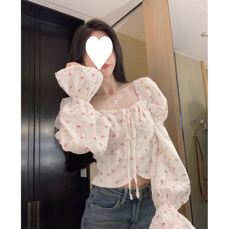 | nameOriginal | French Style Bubble Long-Sleeved Floral Shirt Women's Early Autumn Square Collar Waist Strap Design Niche Short Chiffon Top |