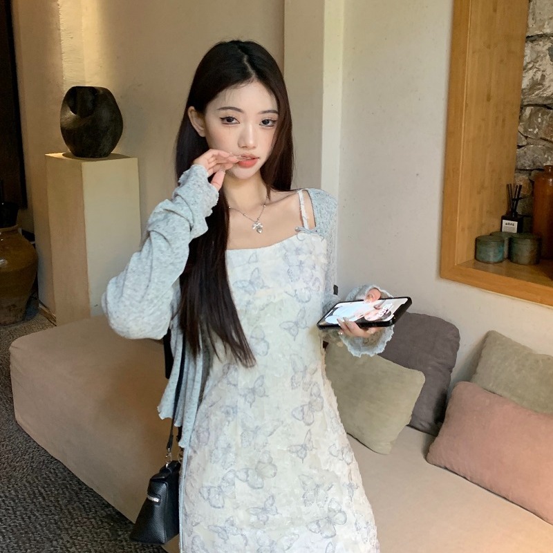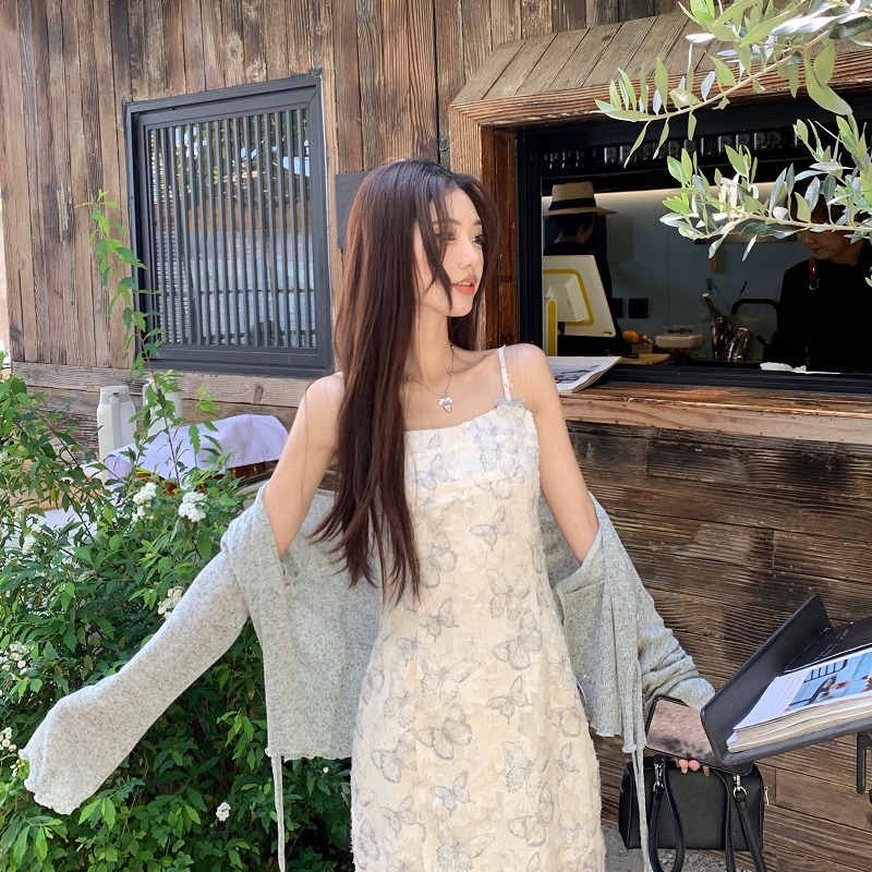 French Style Butterfly Burned Flower Sling dress Women’s Summer Elegant Slimming Short Skirt Sunscreen Short Cardigan Two-piece Set