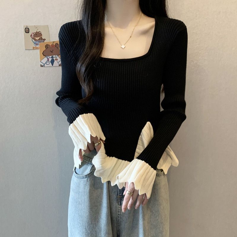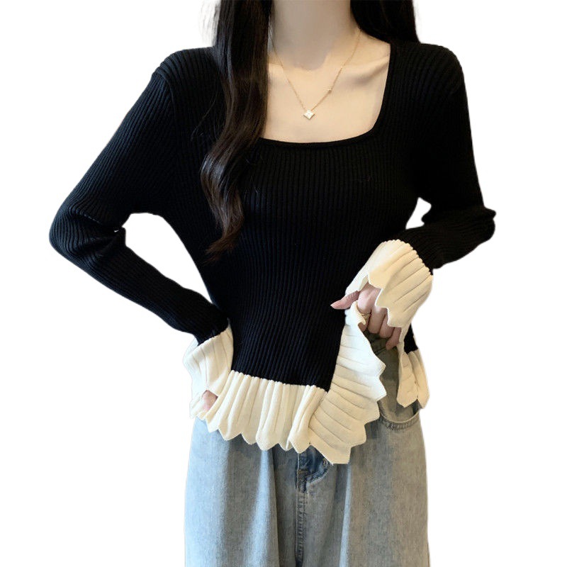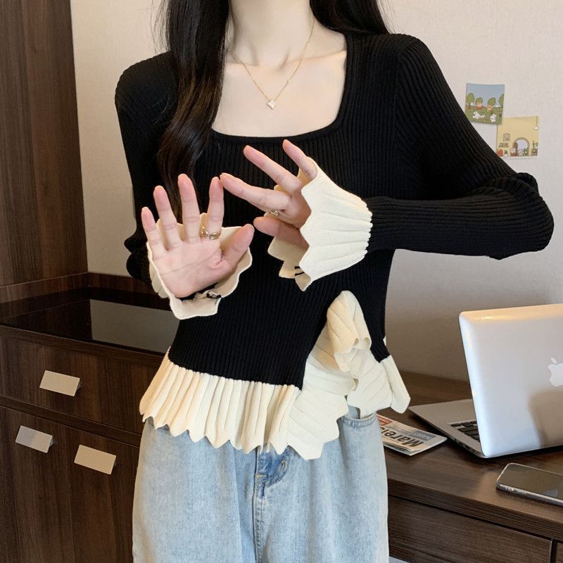 | nameOriginal | French Style Design Irregular Long-sleeved Sweater Women's Autumn Slim-fit Slimming Square Collar Ruffled T-shirt Top |