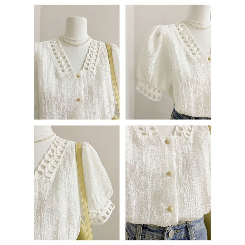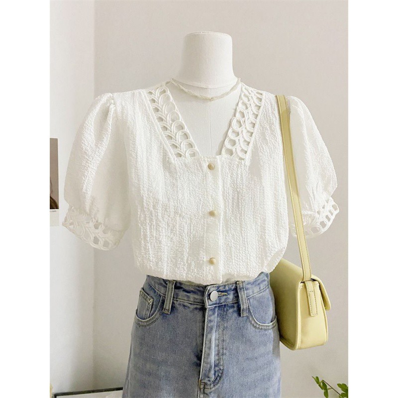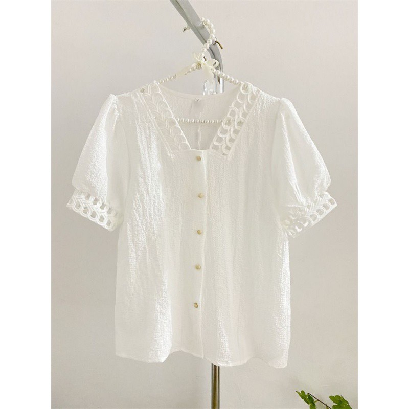 | nameOriginal | French Style Elegant Collar Puff Sleeve Shirt Women's Design Sense Loose Western Style White Short Sleeve Chiffon Hollow Top for Summer |