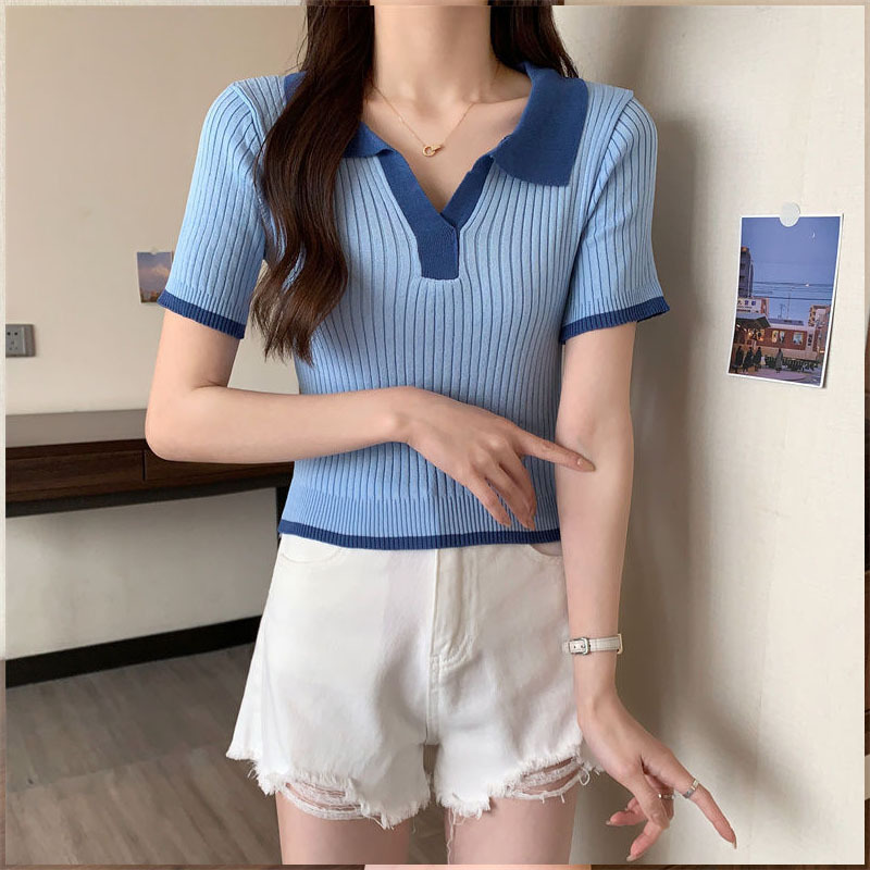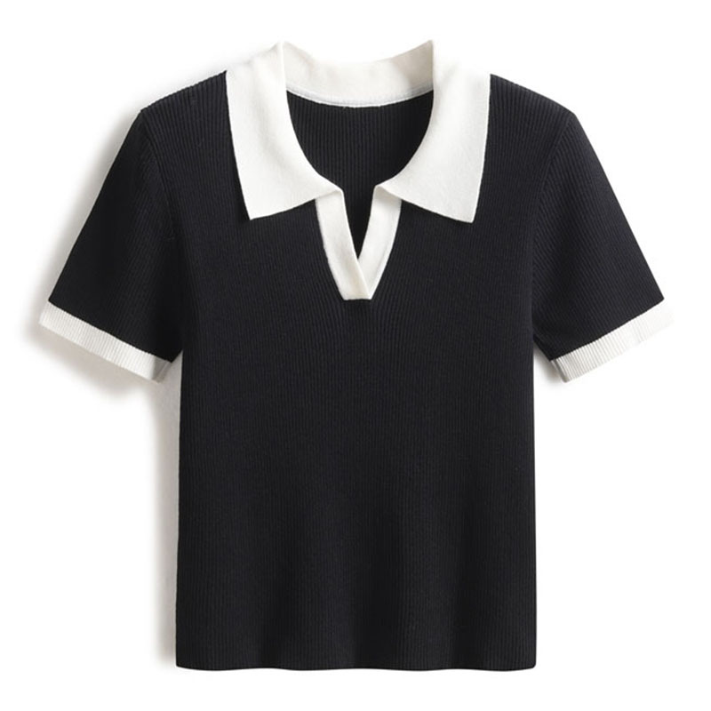 French Style Elegant Ice Silk Knitted Short-sleeved T-shirt Women's Summer Contrast Lar Polo Shirt Thin Shoulder Slim-fit Top