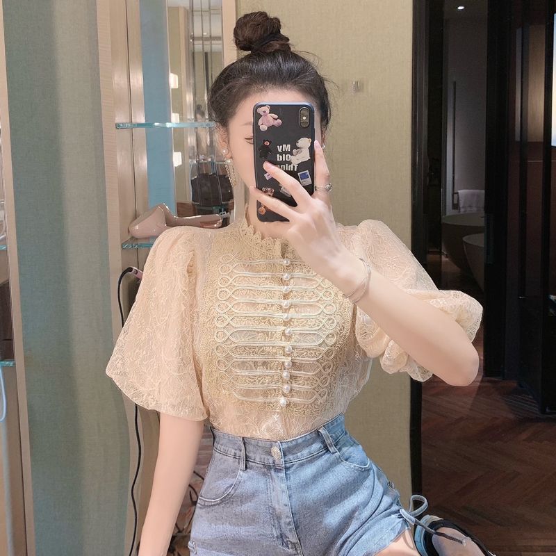 French Style Elegant Puff Sleeve Lace Top Women’s 2024 Summer New Design Niche Beaded Chiffon Shirt