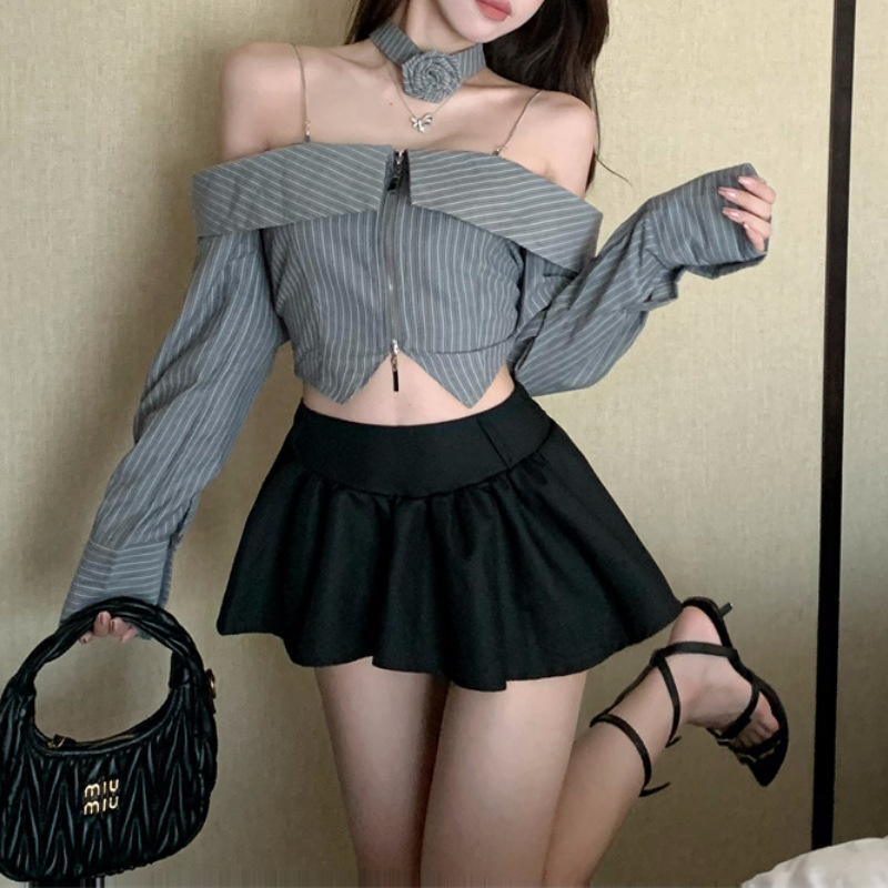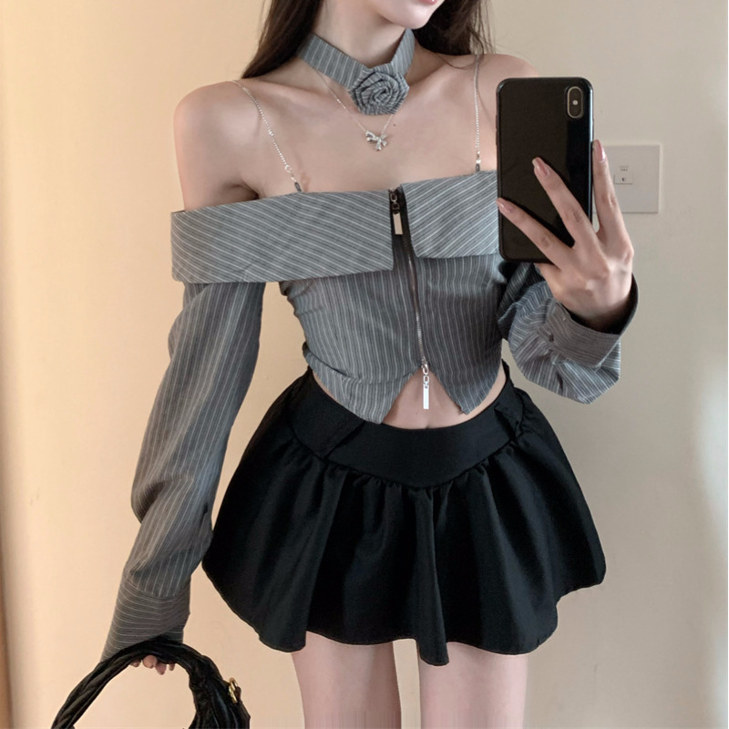 | nameOriginal | French Style Elegant Striped Shoulder Long Sleeve Shirt Women's Spring and Autumn 2024 Hot Girl Short Slim Fit Cropped Top |