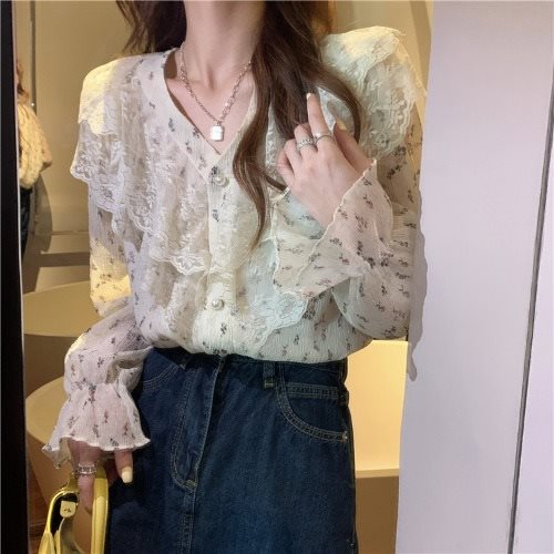 French Style Gentle Floral Chiffon Shirt Women's Spring Long Sleeve Top Design Niche Chic Tea Break Style Shirt