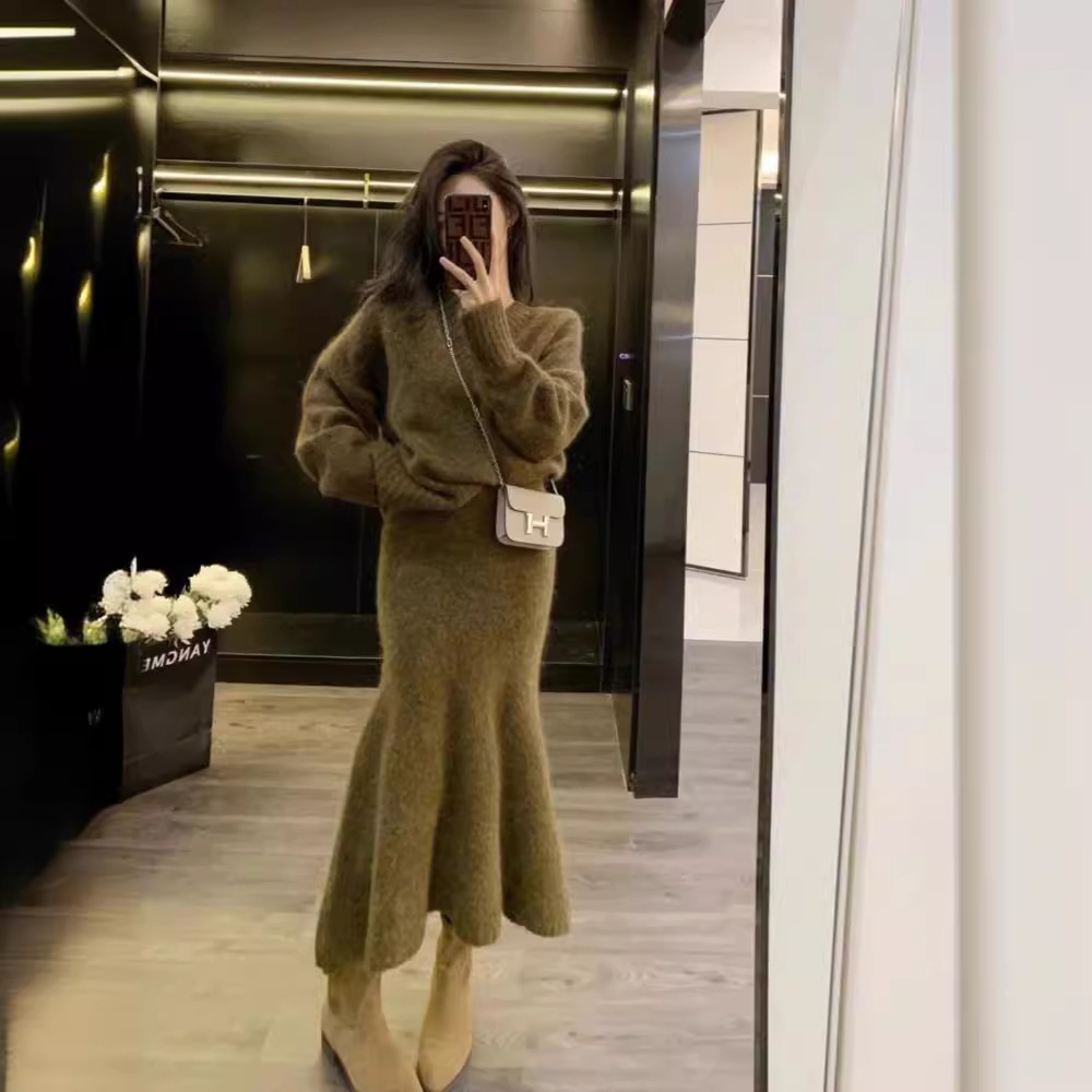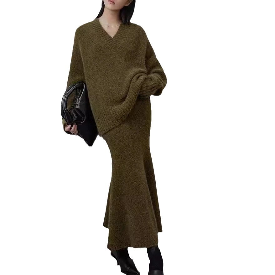 | nameOriginal | French Style Gentle V-neck Soft Waxy Knitted Sweater Women's Autumn and Winter High-end High-waist Fishtail Half-length Skirt Two-piece Suit |