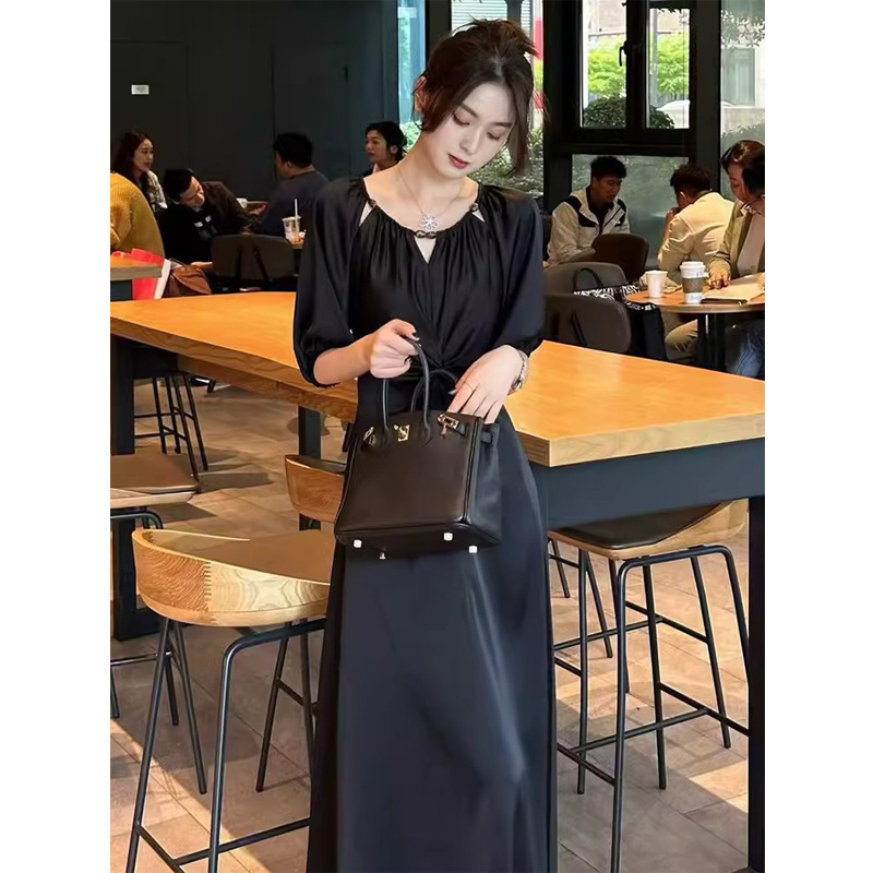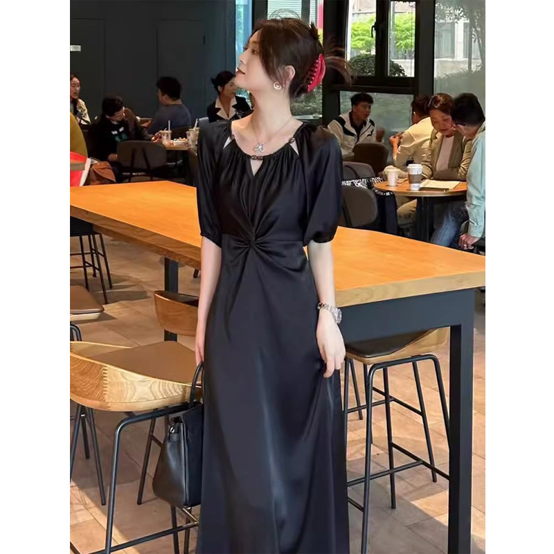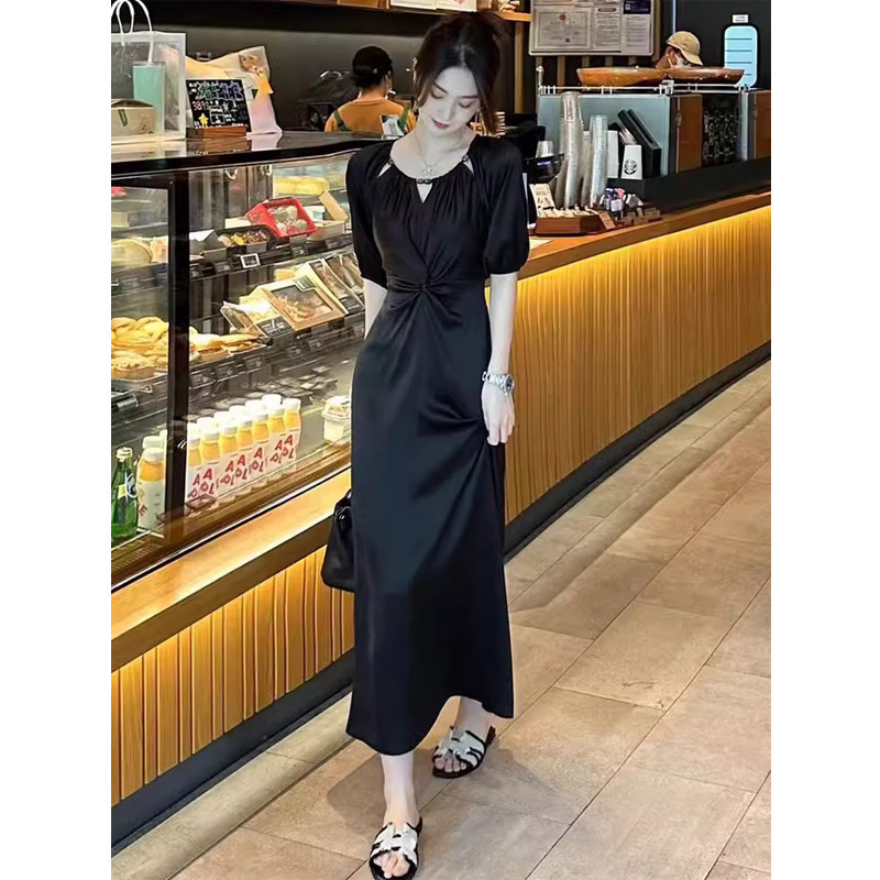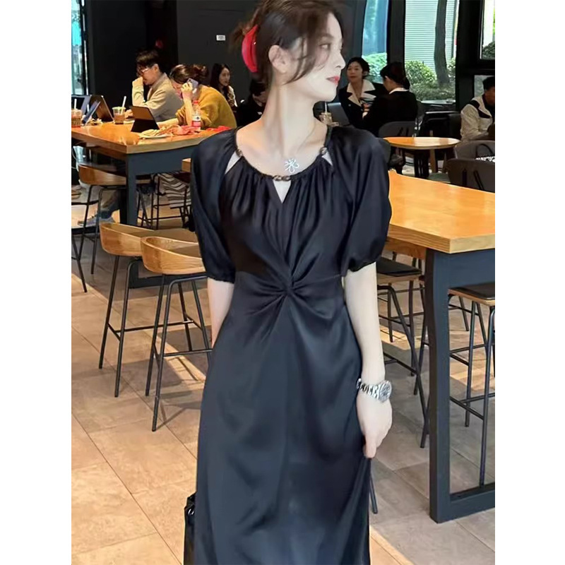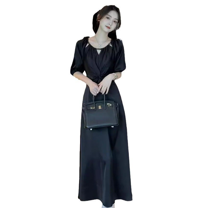French Style Hollow-out Short-sleeved dress Tight Waist Slimming Design Sense Black All-match Elegant Mid-length Skirt