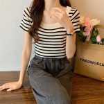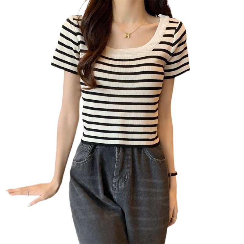 | nameOriginal | French Style Large Collar Black and White Striped Shoulder Square Collar Short-sleeved Shirt Women's Summer Design Sense Niche Short Collarbone Top |