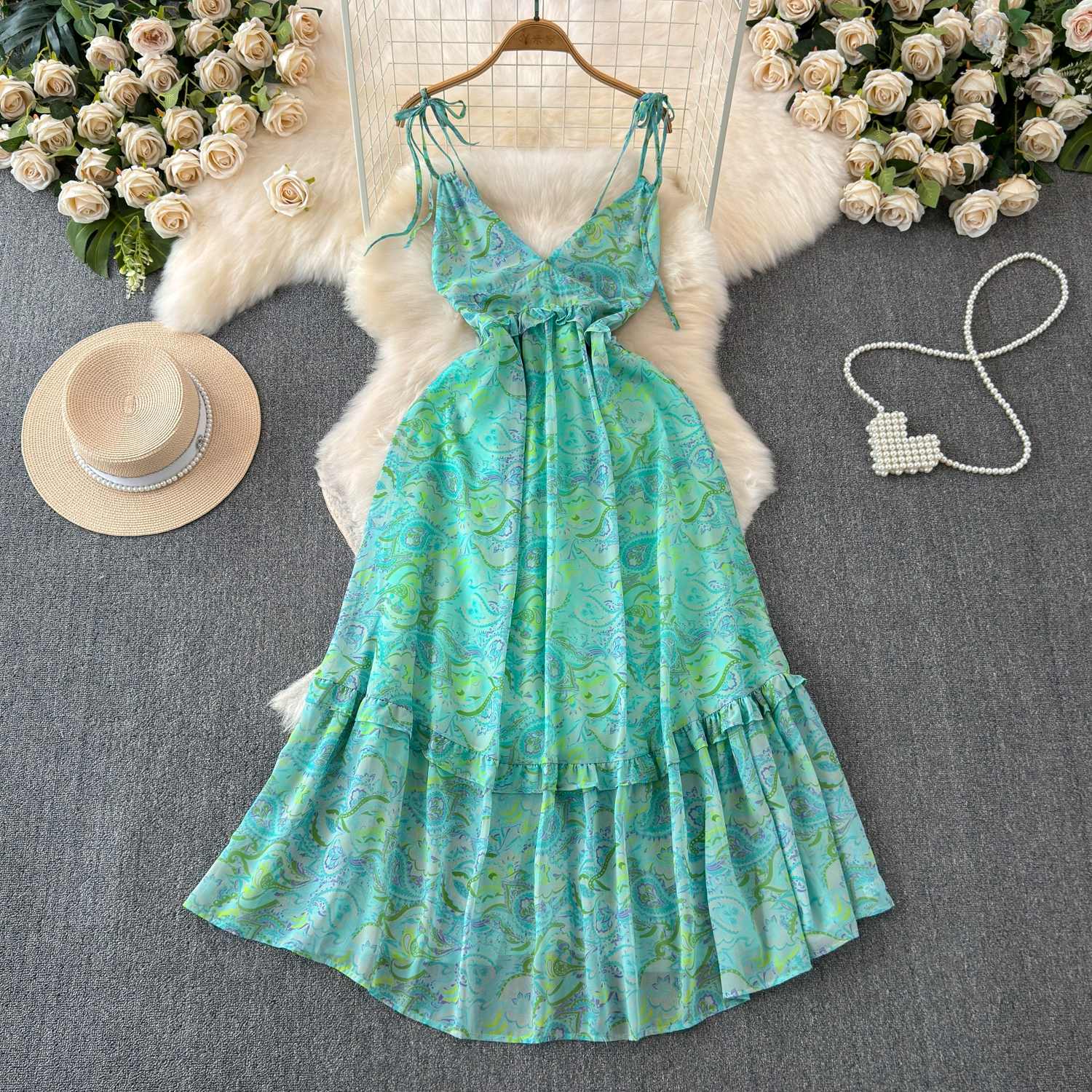 | nameOriginal | French style mint green v-neck halterneck suspender dress 2024 summer dopamine seaside vacation fairy dress |