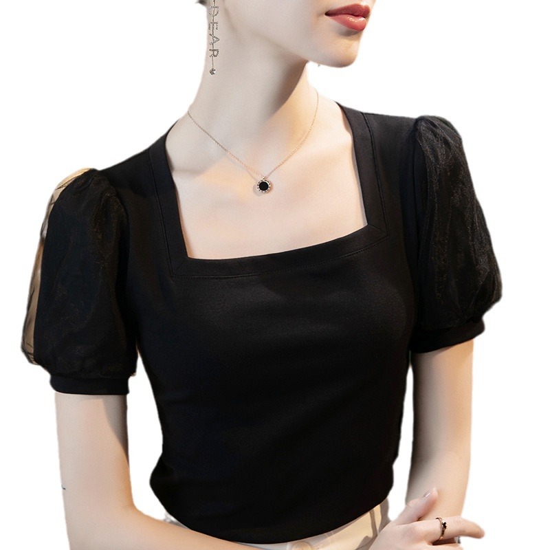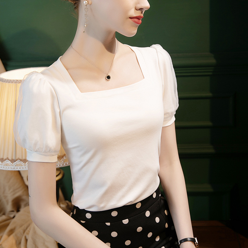 | nameOriginal | French Style Pure Cotton Square Collar T-shirt Elegant Mesh Stitching Bubble Sleeve T-shirt Women's Short-sleeved Slim-fit 2022 Summer Small Shirt |