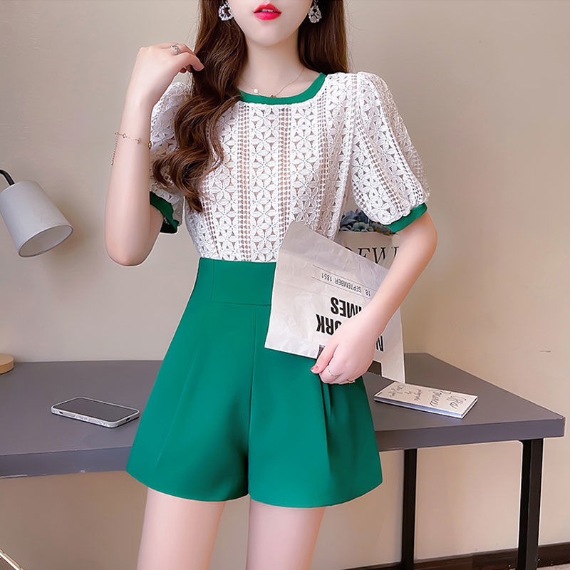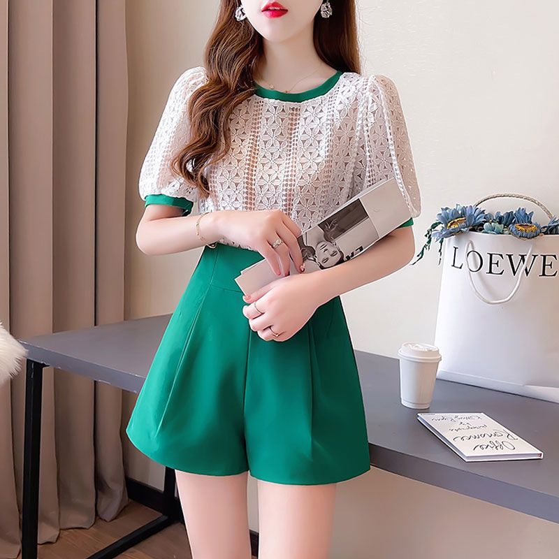 | nameOriginal | French Style Romantic Shorts suit Women's Retro Green Hollow-out Lace Top High Waist Slimming Wide-leg Pants Two-piece Set |