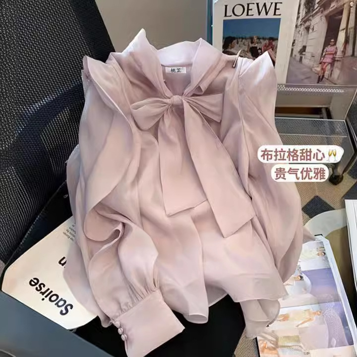 | nameOriginal | French style ruffled lace-up bow shirt Women's Spring New loose all-match Chanel style long sleeve chiffon top |