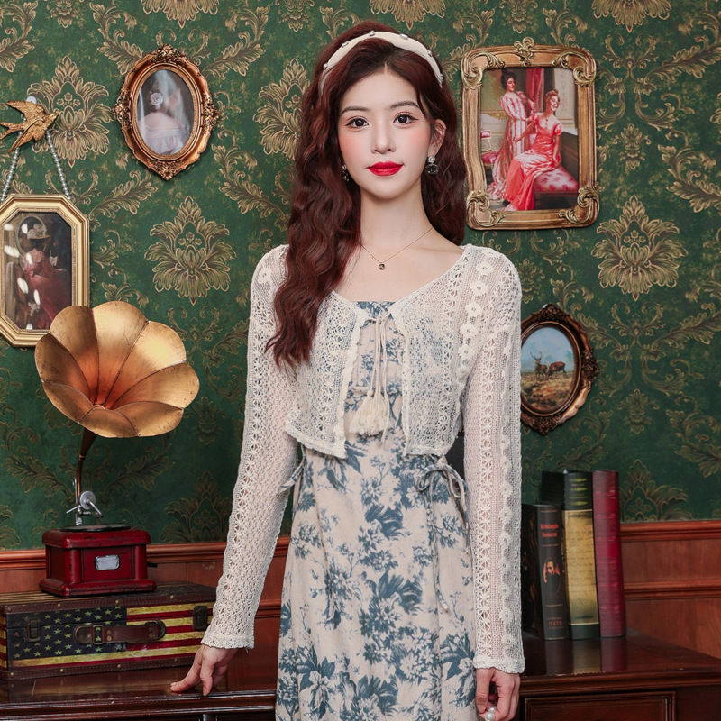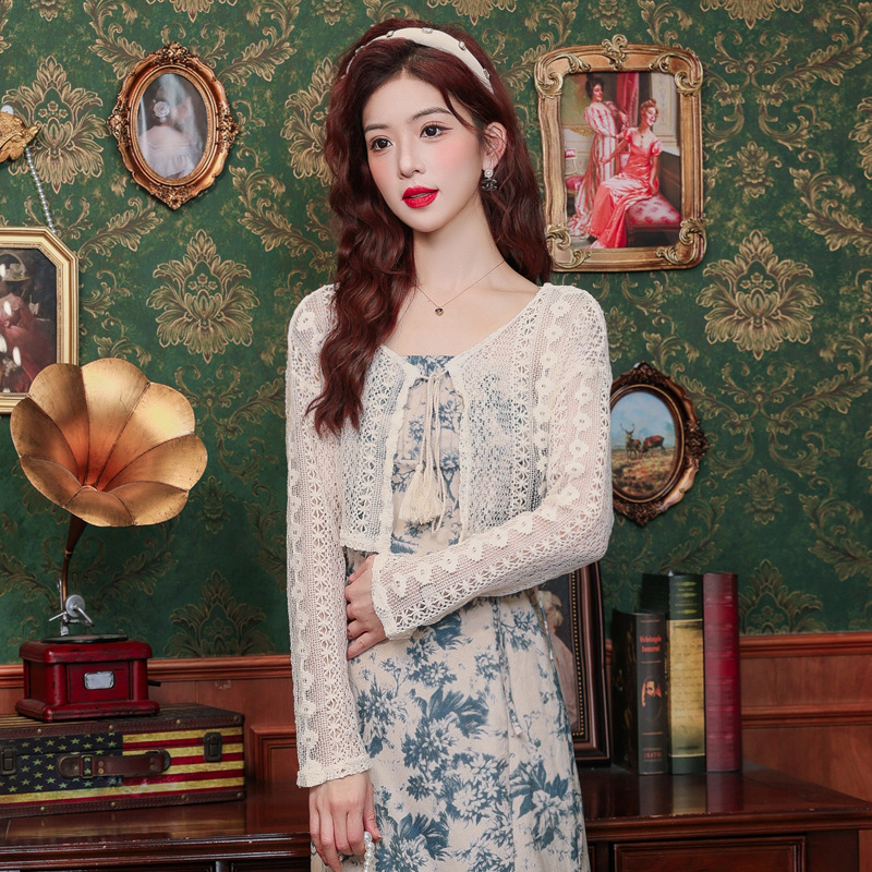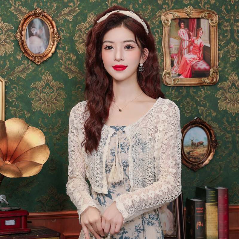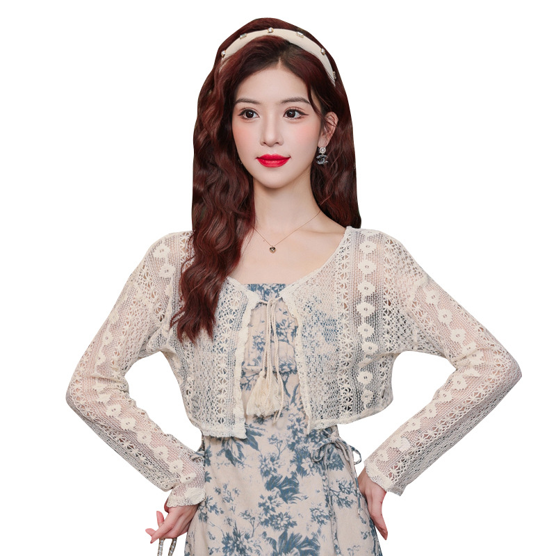 | nameOriginal | French Style Short Long-Sleeved Hollow Design Lace Top Women's Summer Vacation Lace-Up Sunscreen Blouse Small Cardigan |