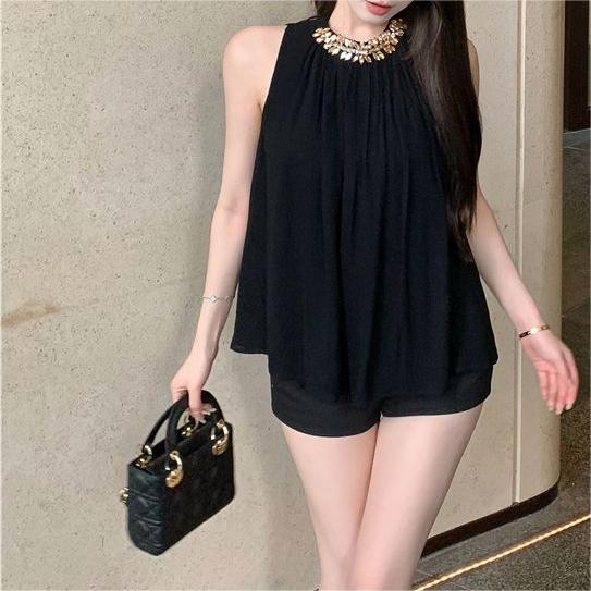 | nameOriginal | French Style Sleeveless Chiffon Shirt with Hanging Neck Women's 2024 Summer New Arrival Heavy Industry Diamond Chain Loose Slimming Black Hot Girl Shirt |