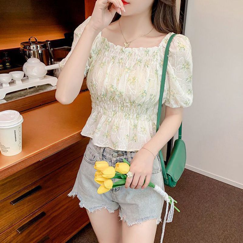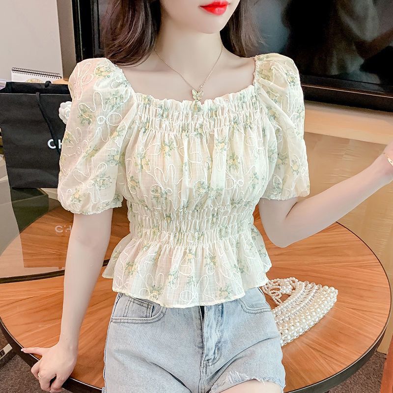 | nameOriginal | French Style Square Collar Floral Top Fresh Style 2024 New Style Small Shirt Tight Waist Stylized Pleated Short Short Sleeve Chiffon Shirt |