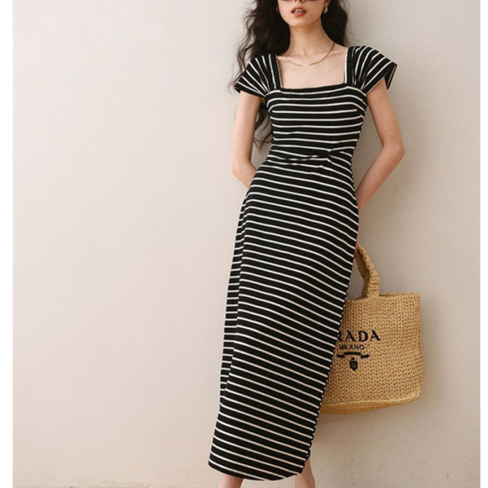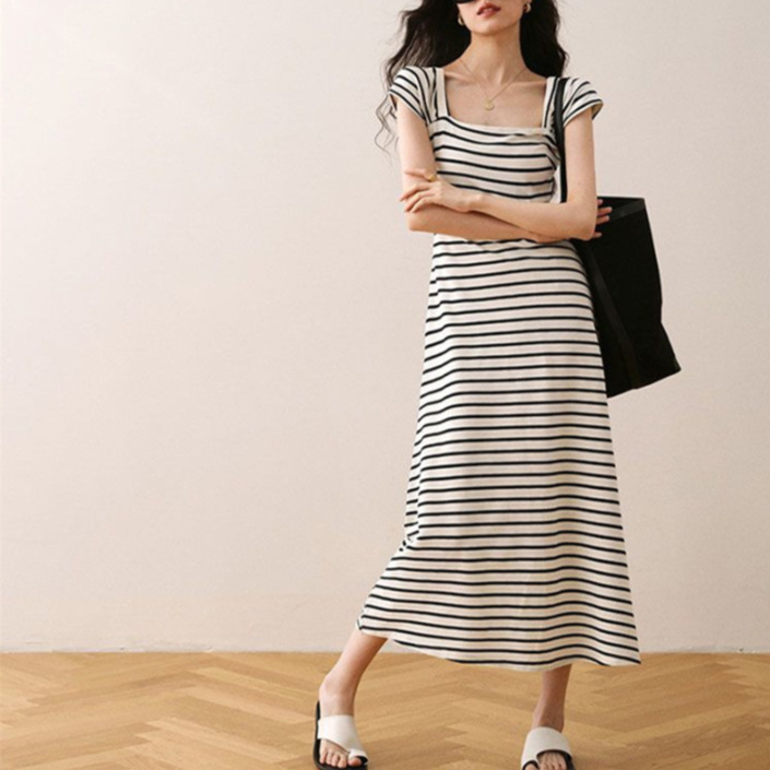 | nameOriginal | French Style Striped Square Collar dress Women's Summer Seaside Elegant Slim-fit Collarbone Sleeveless Long Dress |