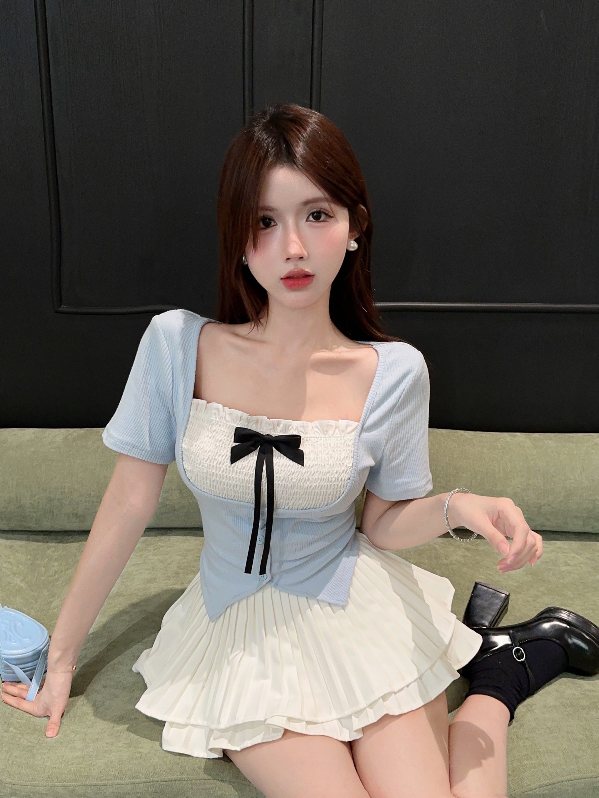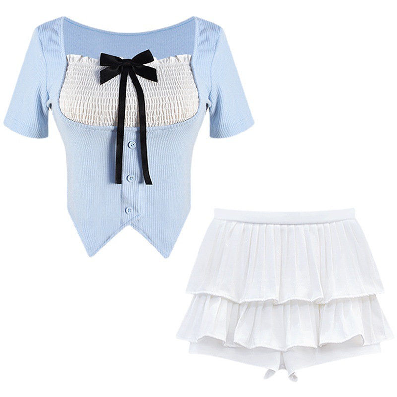 | nameOriginal | French Style Sweet Spice Girl Design Sense Niche Bow Short-sleeved T-shirt High Waist Half-length Skirt Slim-fit suit Women's Summer |