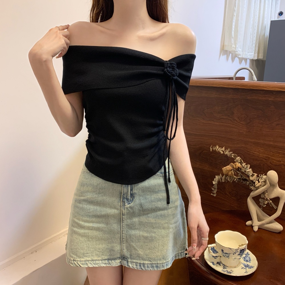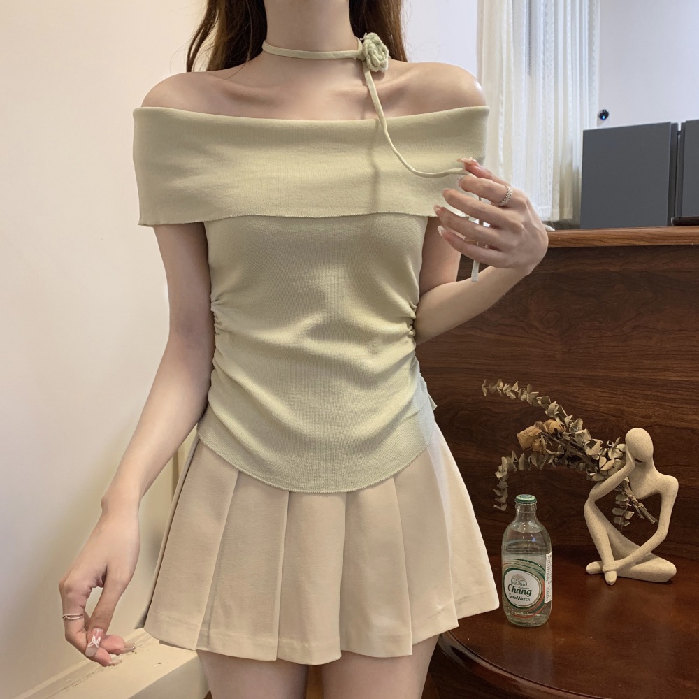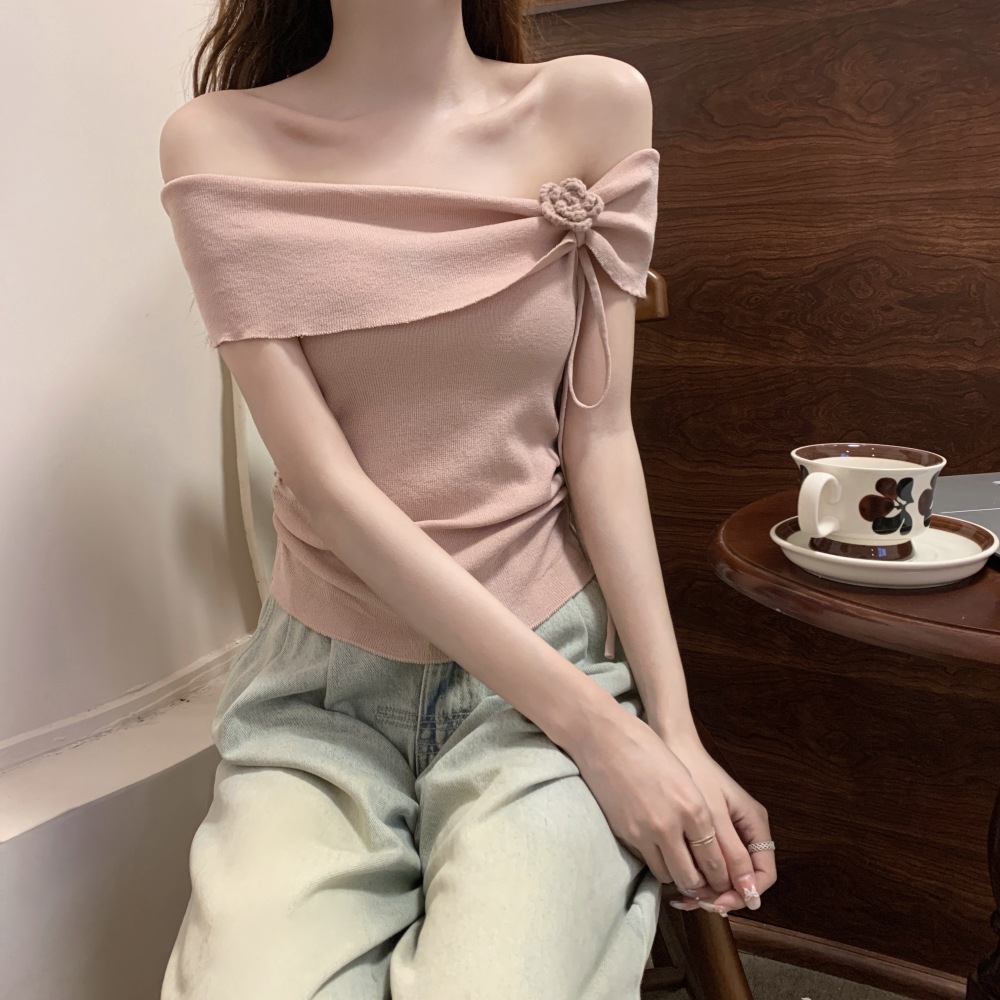 | nameOriginal | French Style Three-Dimensional Flower Design Sense Tight Waist Ice Silk Short Knitted Women's Drawstring Pleated Shoulder Short-Sleeved Top |