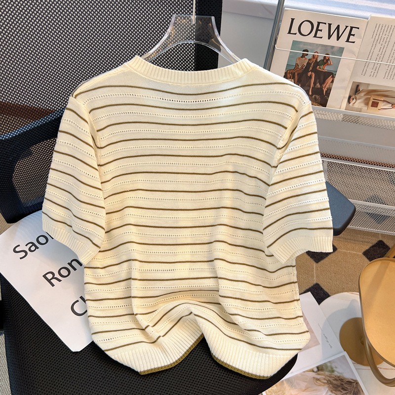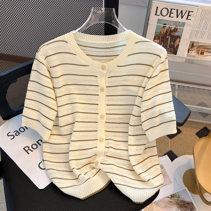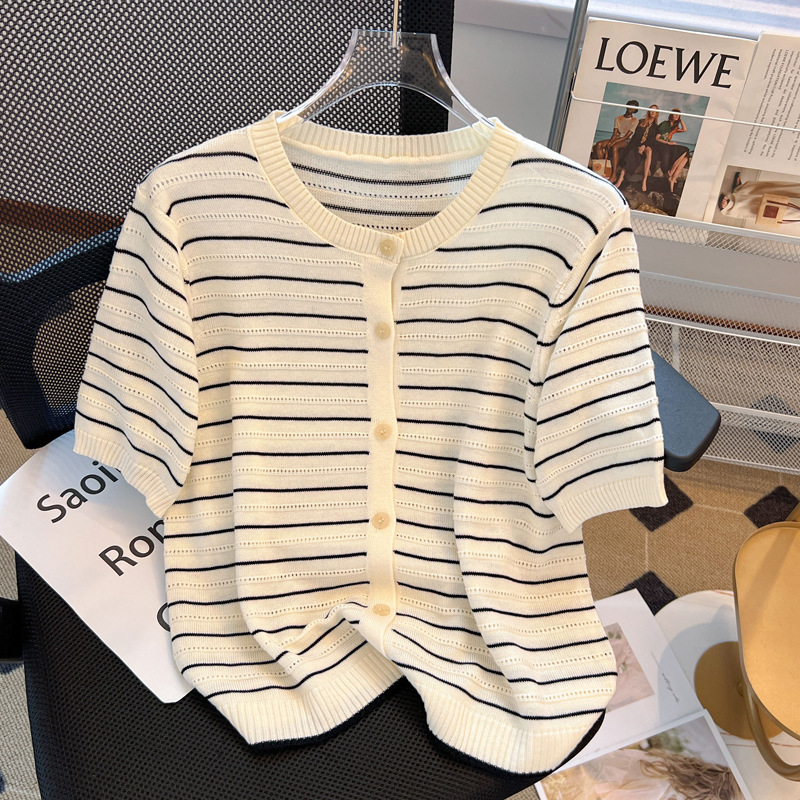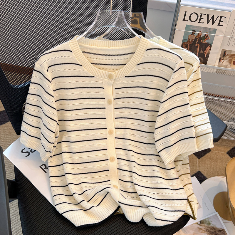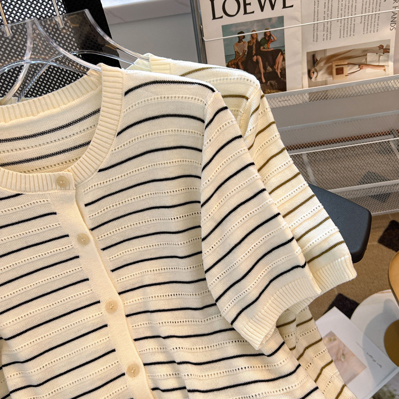 | nameOriginal | French Style Vintage Striped Ice Silk Knitted Cardigan Women's Thin 2024 Summer Loose Slimming Age-reducing Short-sleeved Top |