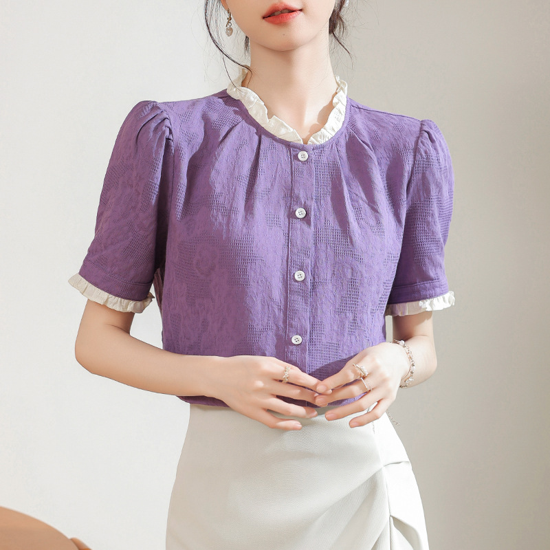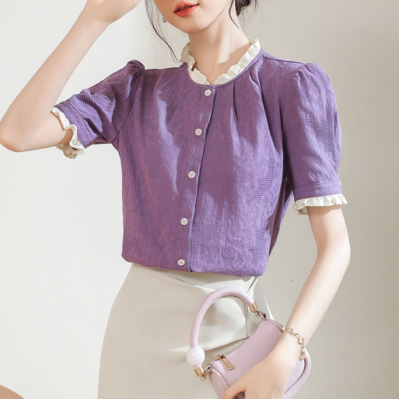 French-style Wood-ear Short-sleeved Shirt Top Women's 2024 Summer New Commuting Style Texture Purple Loose Shirt