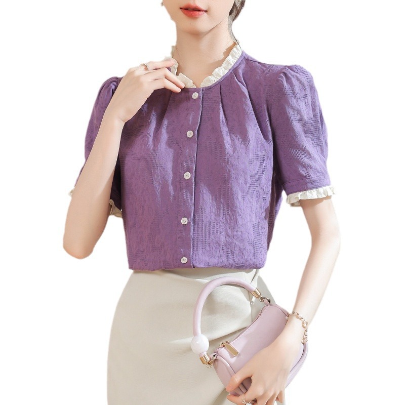 French-style Wood-ear Short-sleeved Shirt Top Women’s 2024 Summer New Commuting Style Texture Purple Loose Shirt