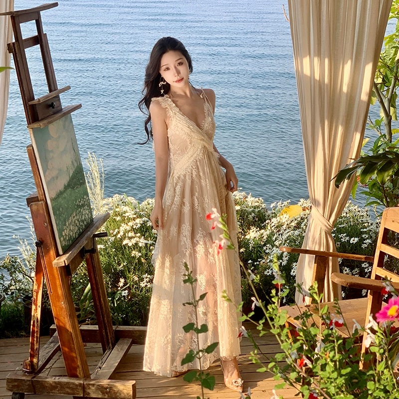 | nameOriginal | French V-neck apricot lace mesh A-line dress, high-end long backless seaside resort style long dress |