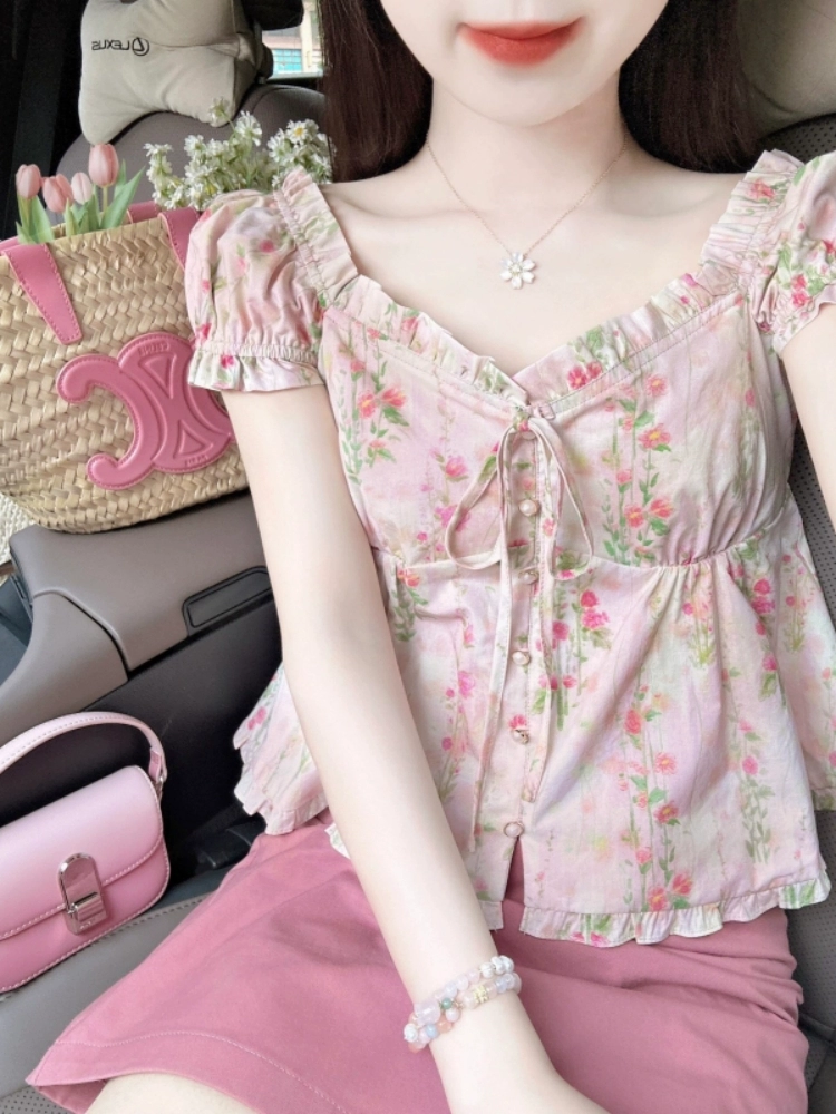 | nameOriginal | French V-neck floral niche puff-sleeve short shirt |