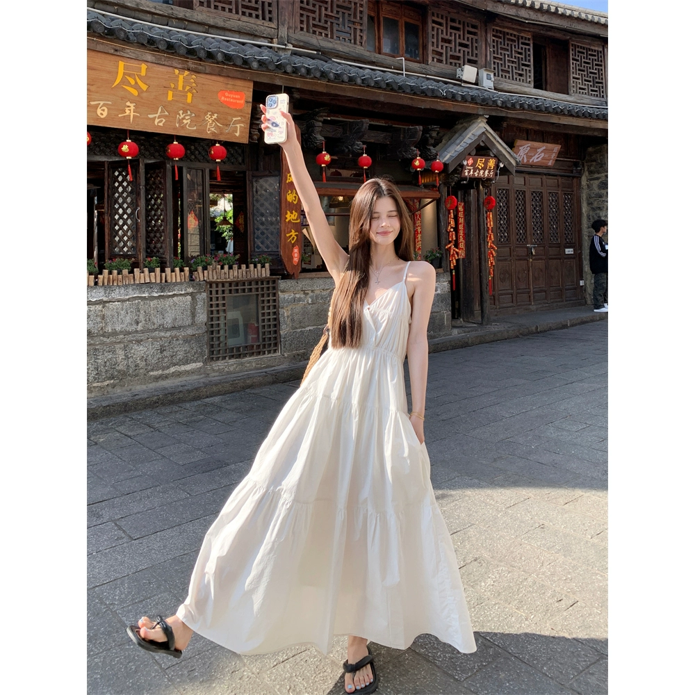 | nameOriginal | French white summer temperament long skirt with V-neck suspenders |