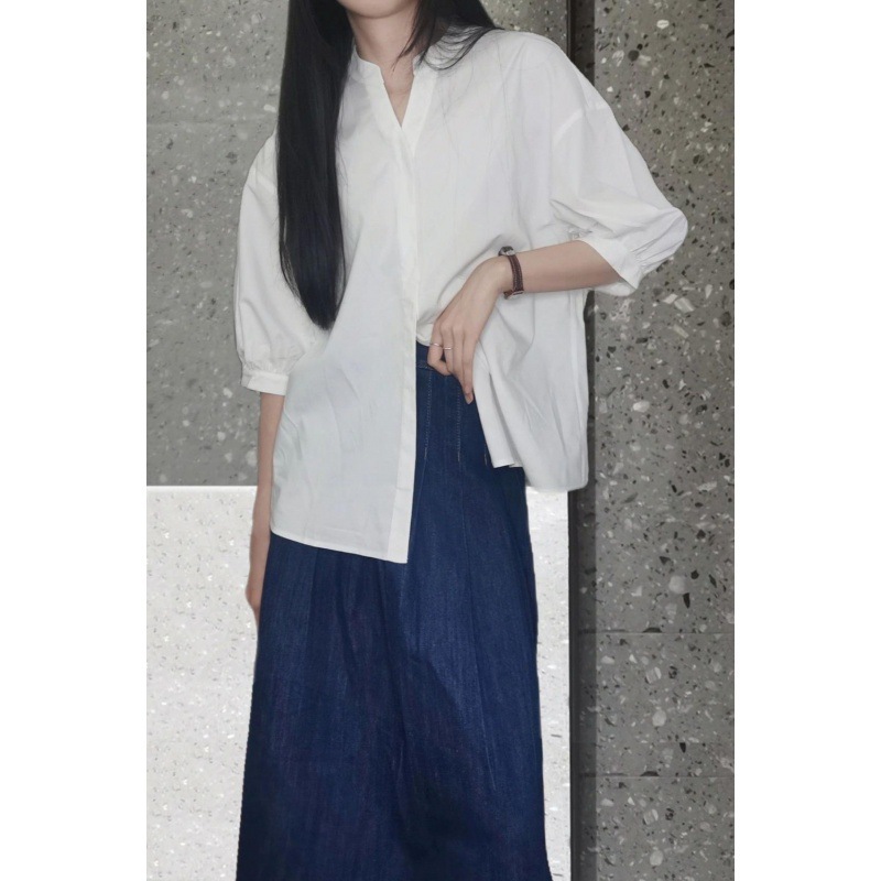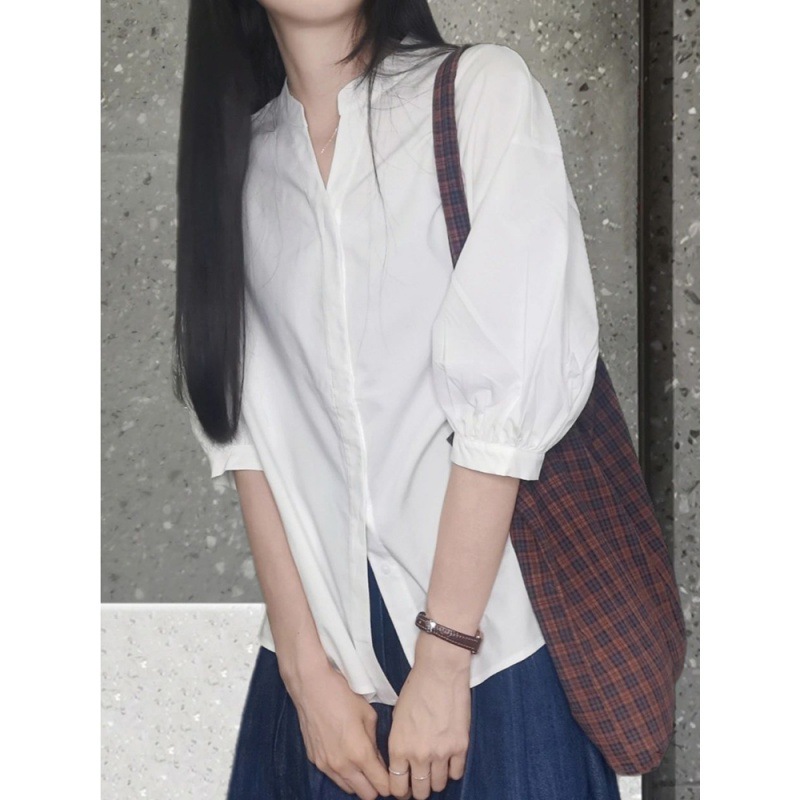 French White V-Neck Elegant Short-Sleeved Shirt Women's Summer Shirt Chic Seven-Sleeve Collar Top