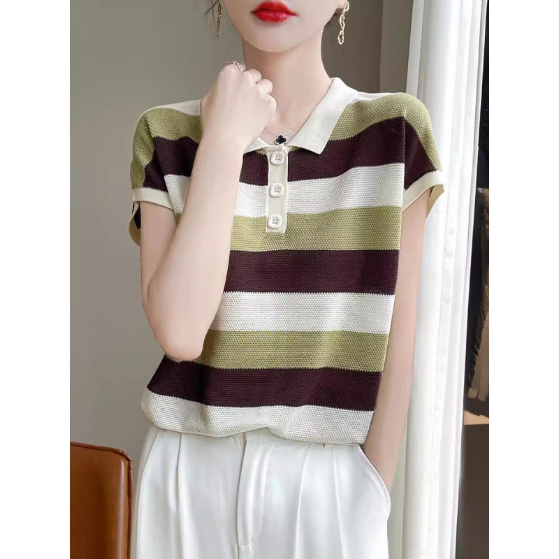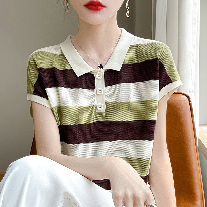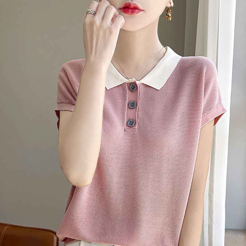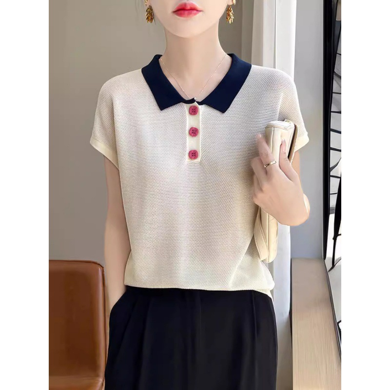 | nameOriginal | Fresh Contrast Color POLO Collar Knitted Short-sleeved Women's Summer New Slimming Age-reducing Tencel Lyocell Lassel T-shirt Top |